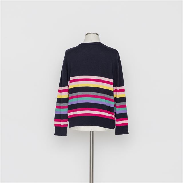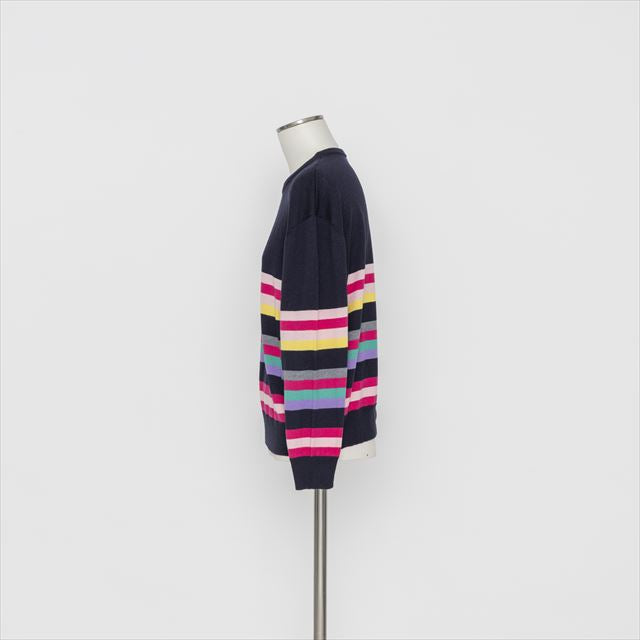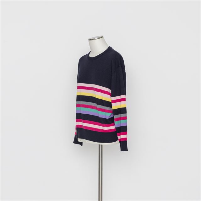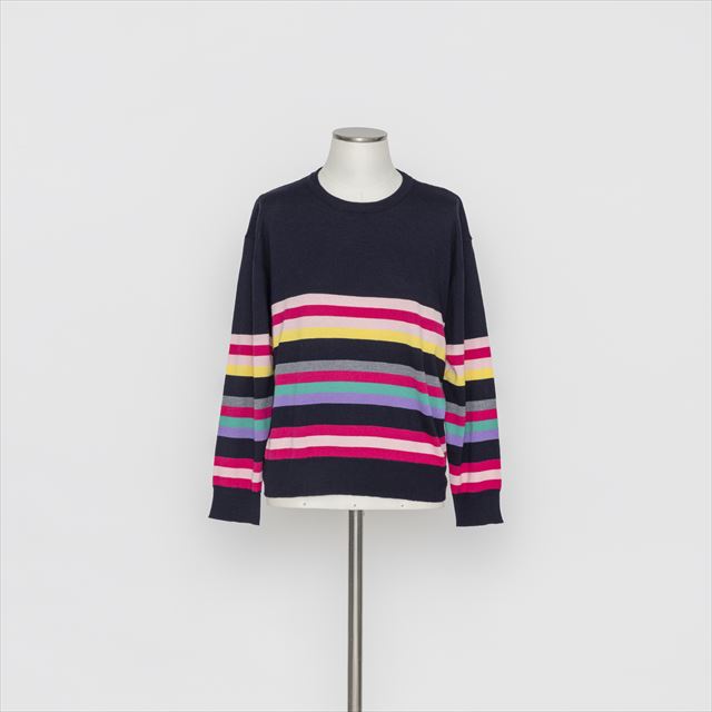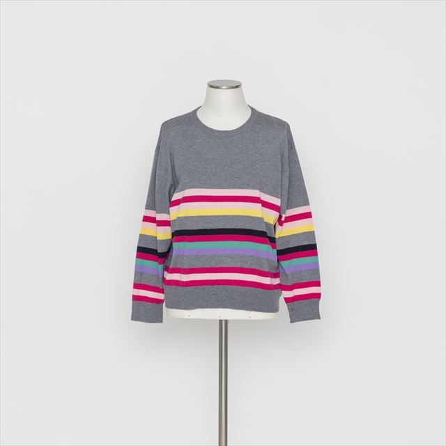 デザイン: 可愛らしいマルチボーダー柄に、胸元の無地デザインを組み合わせ、大人っぽいバランスに。コンパクトなネックラインが上品な印象を与えます。