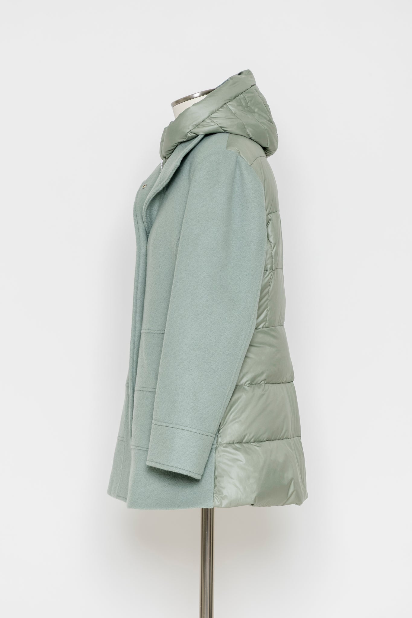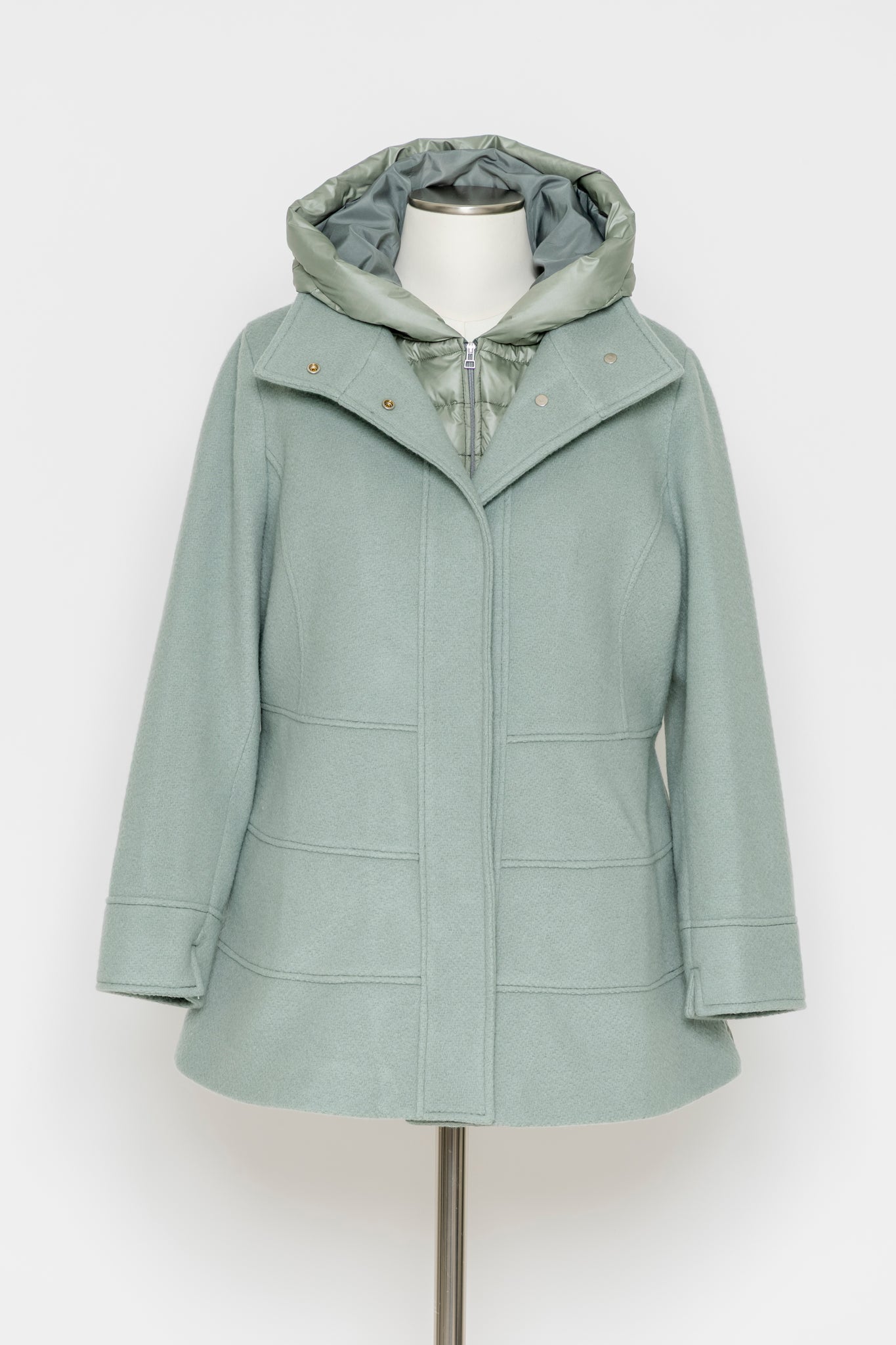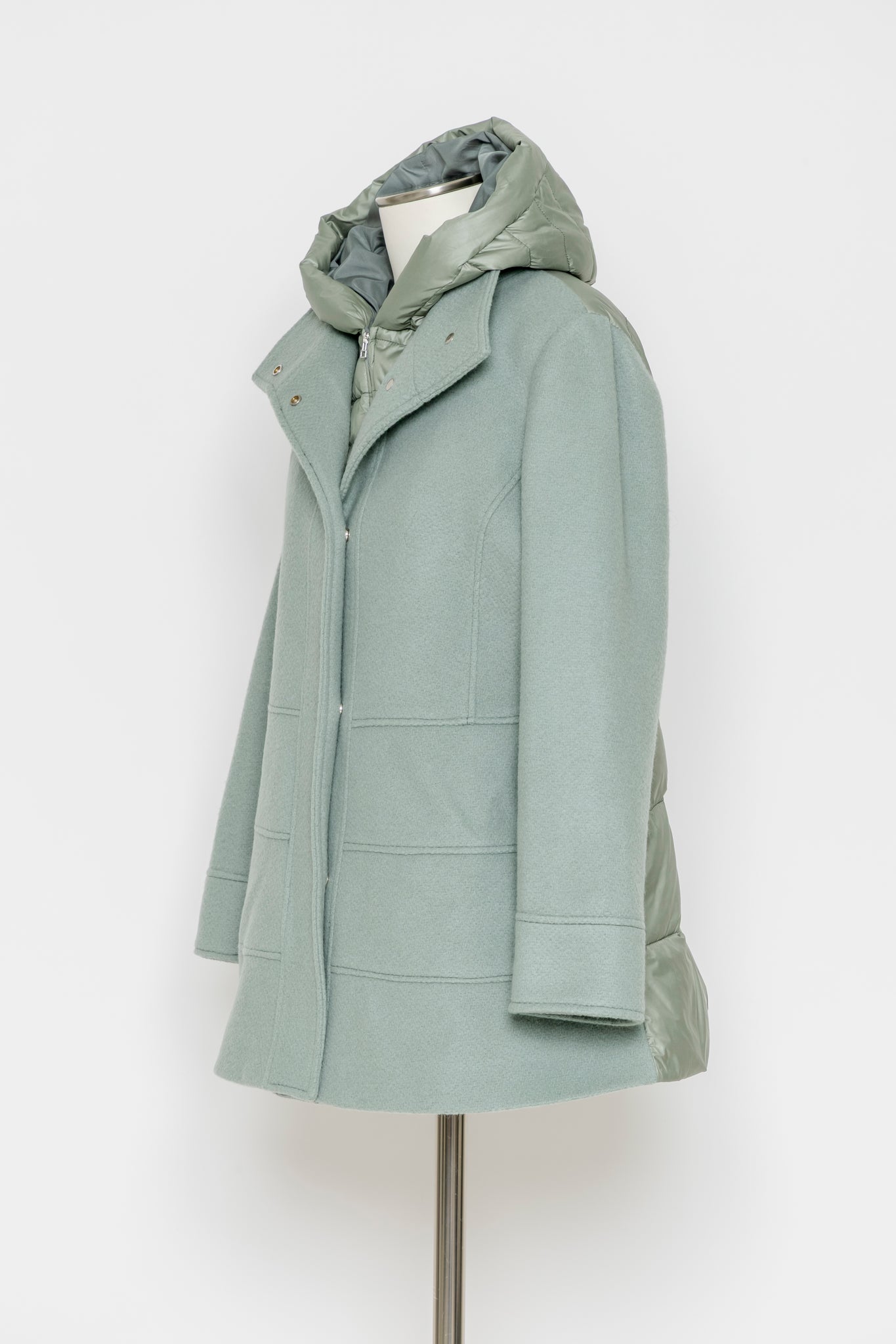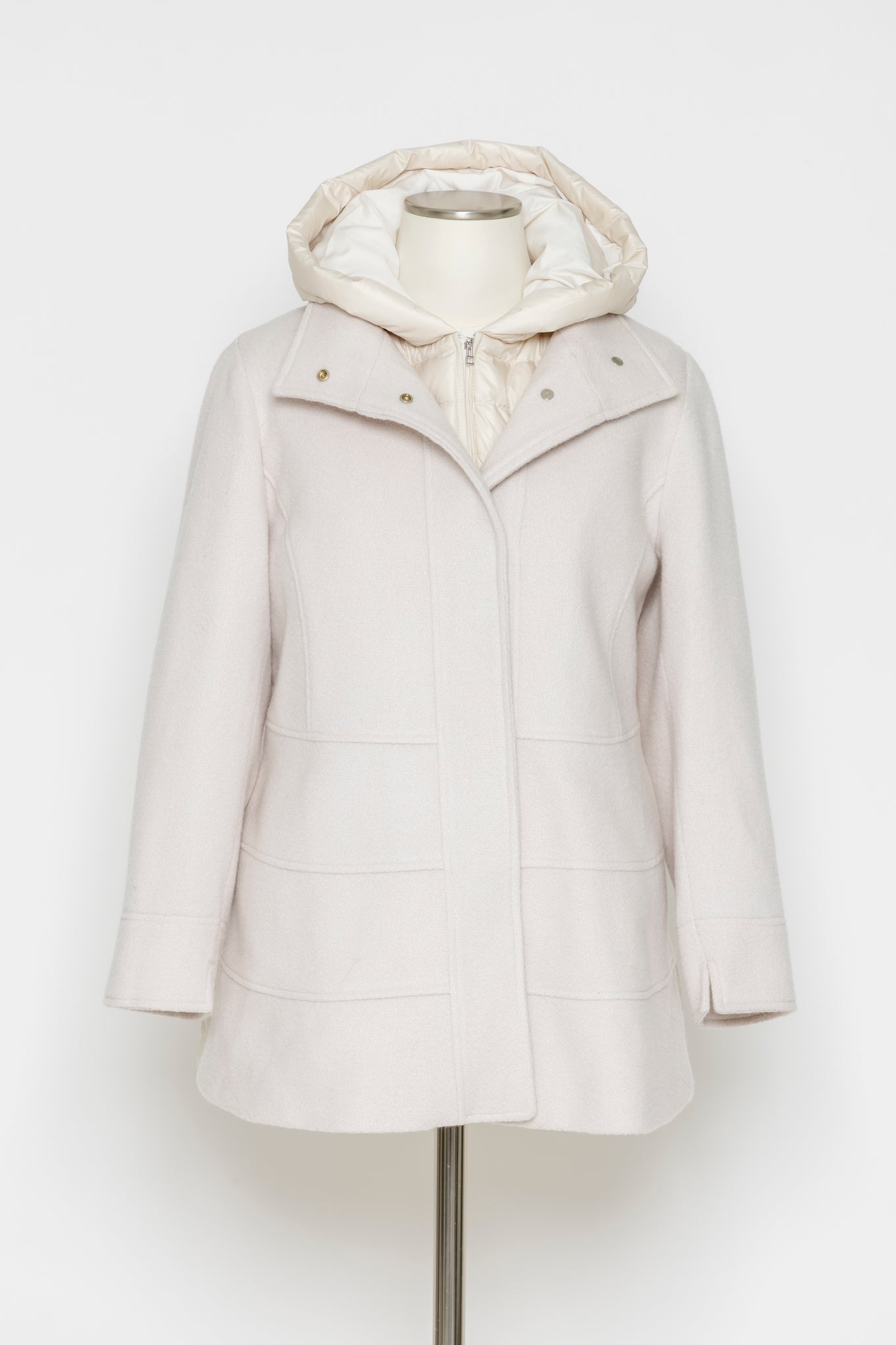 デザインの特徴:上質なウール90%にナイロンをブレンドした本体に、ダウン90%・フェザー10%の中綿ライナーを合わせた、贅沢な3ウールAY仕様のコートです。ライナー部分は取り外し可能で、フード付きダウンベストとして単体でも着用できます。ライナーを外すと、裏地なしの軽やかなウールコートとしても楽しめる設計。シンプルながら立体的な切り替えラインがスタイルを美しく見せ、洗練された印象を演出します。