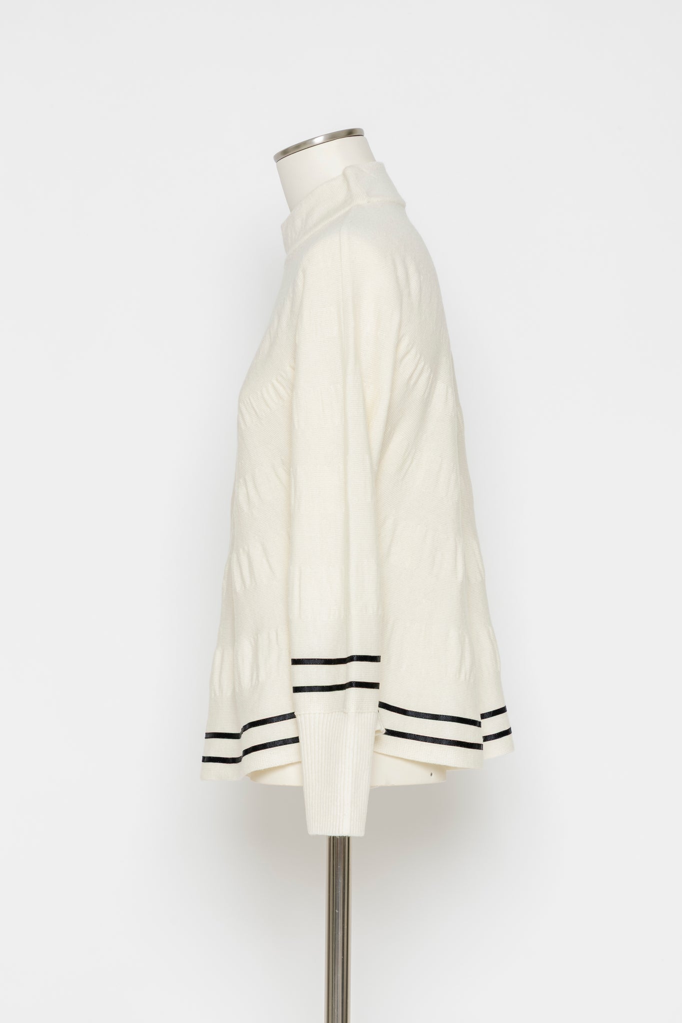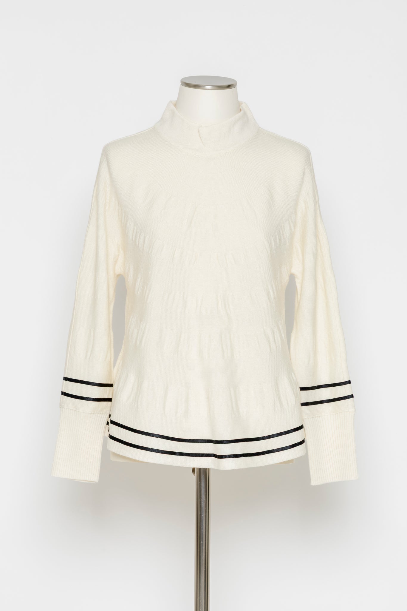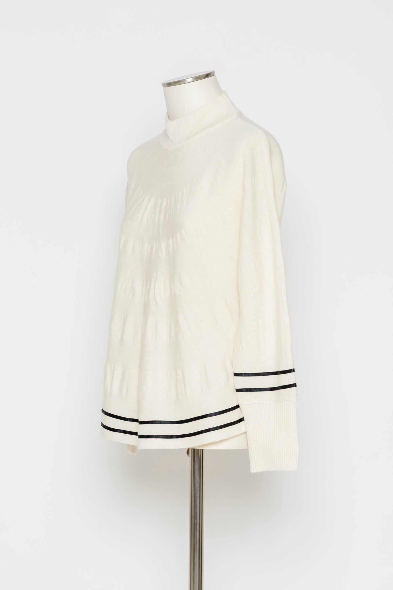 デザインの特徴:上質なウールにバルキーアクリルを撚糸した、ふくらみのある素材感が魅力のプルオーバーニットです。全体に細やかな凹凸のある編み柄を入れ、シンプルながら表情のある仕上がり。襟元は軽やかなハイネックで首元をやさしく包み、袖口と裾には配色ラインを効かせてスポーティなアクセントをプラスしました。