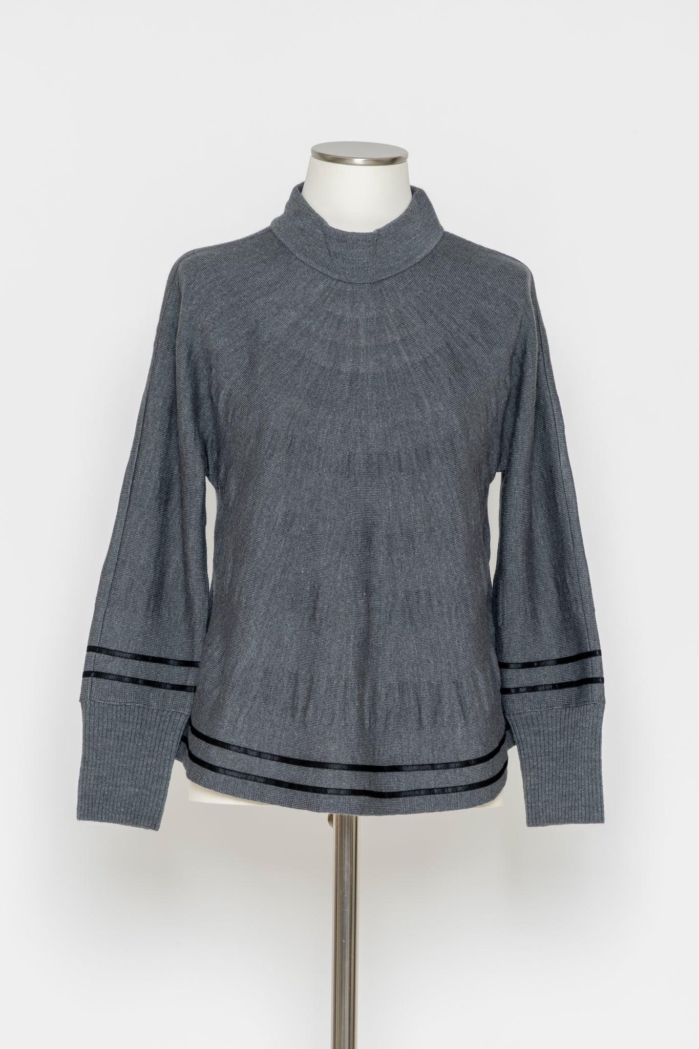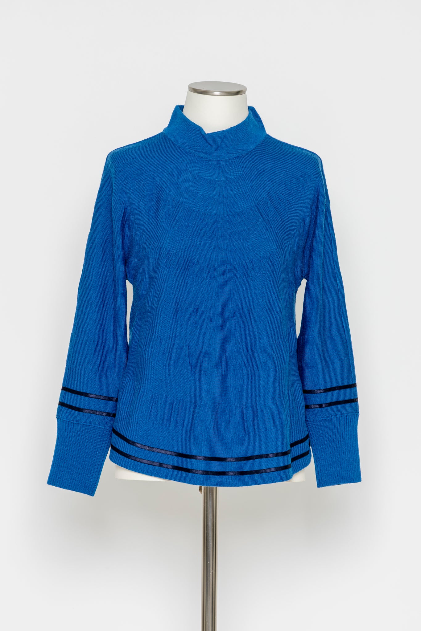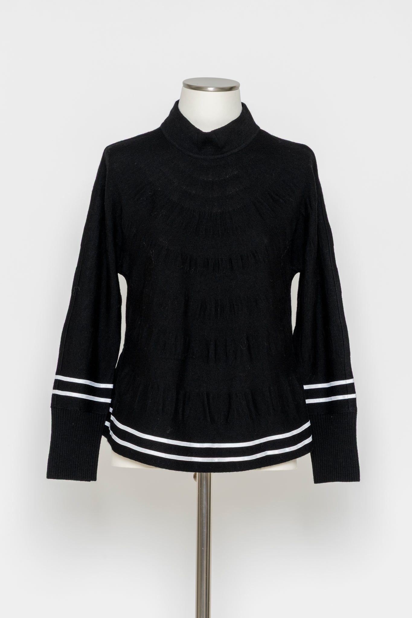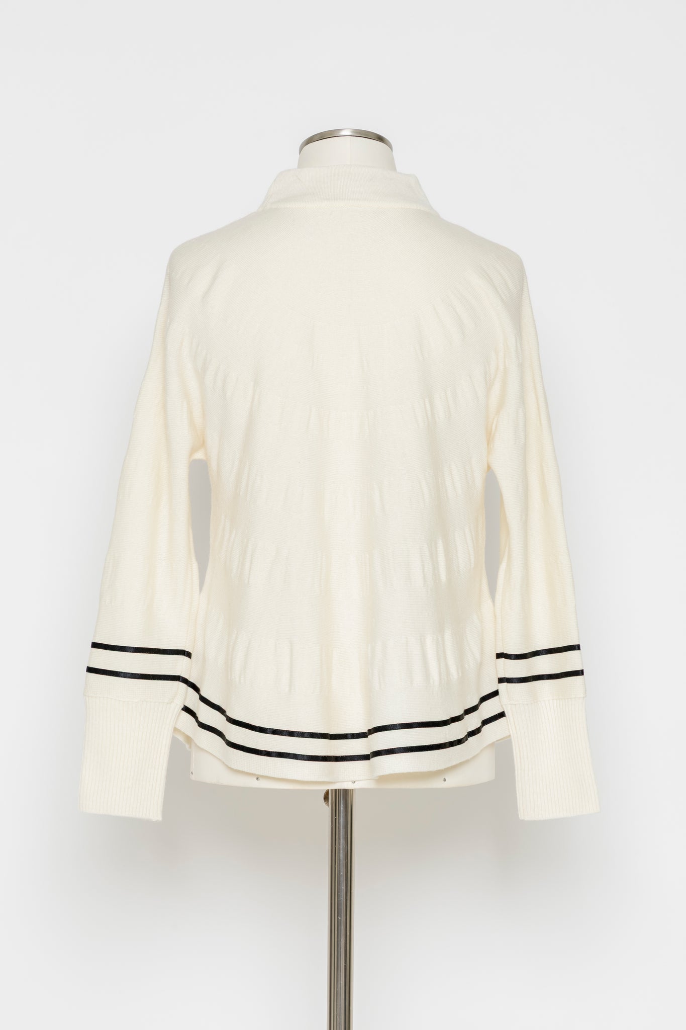 デザインの特徴:上質なウールにバルキーアクリルを撚糸した、ふくらみのある素材感が魅力のプルオーバーニットです。全体に細やかな凹凸のある編み柄を入れ、シンプルながら表情のある仕上がり。襟元は軽やかなハイネックで首元をやさしく包み、袖口と裾には配色ラインを効かせてスポーティなアクセントをプラスしました。