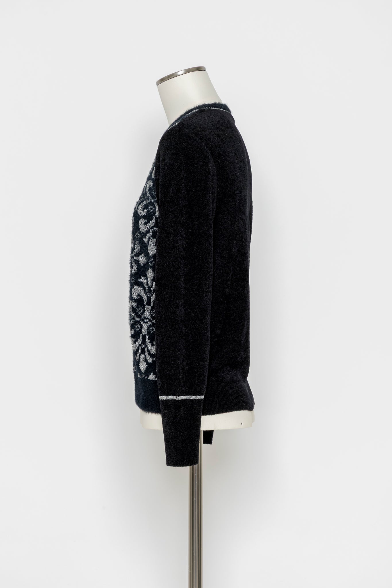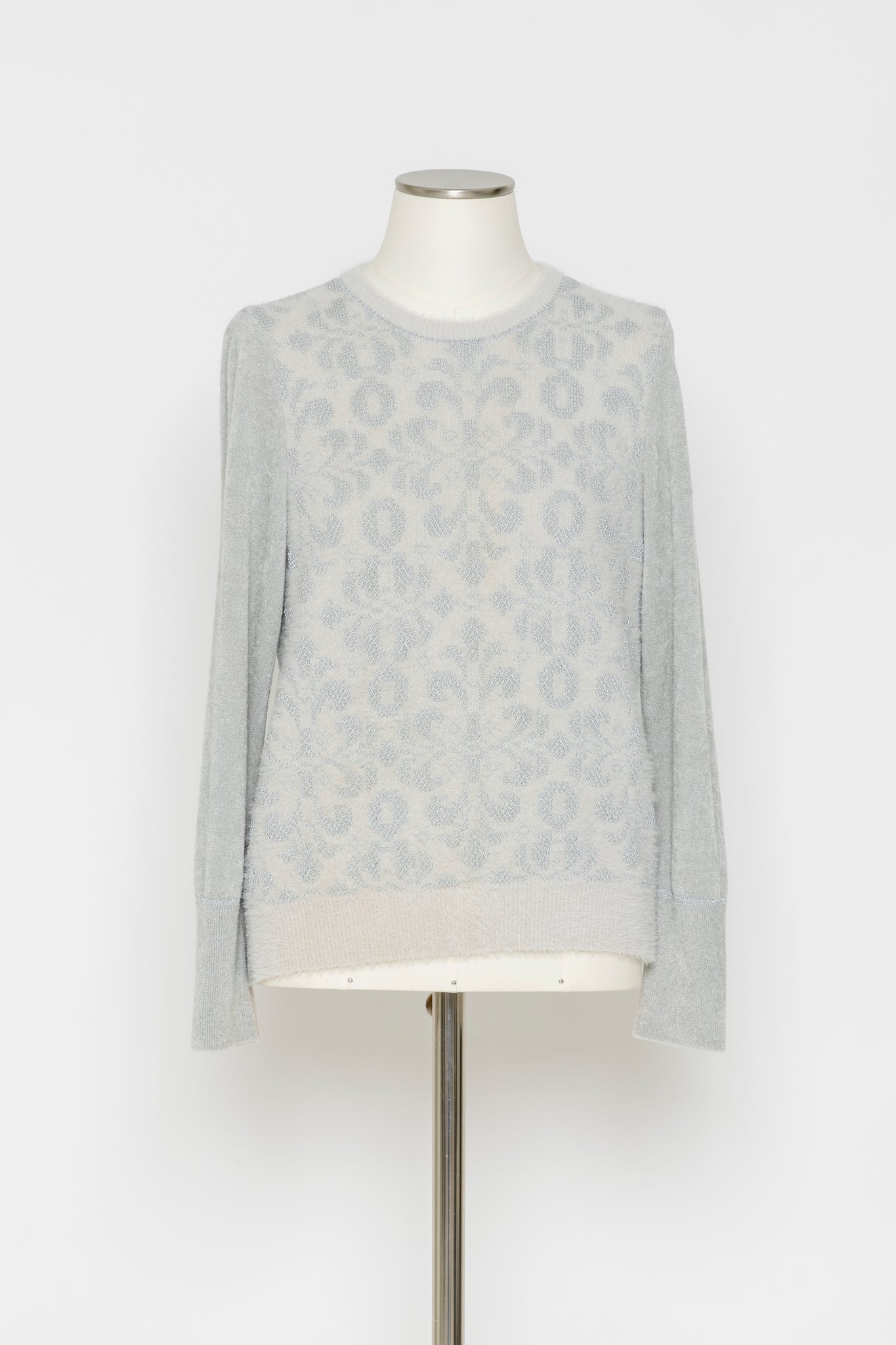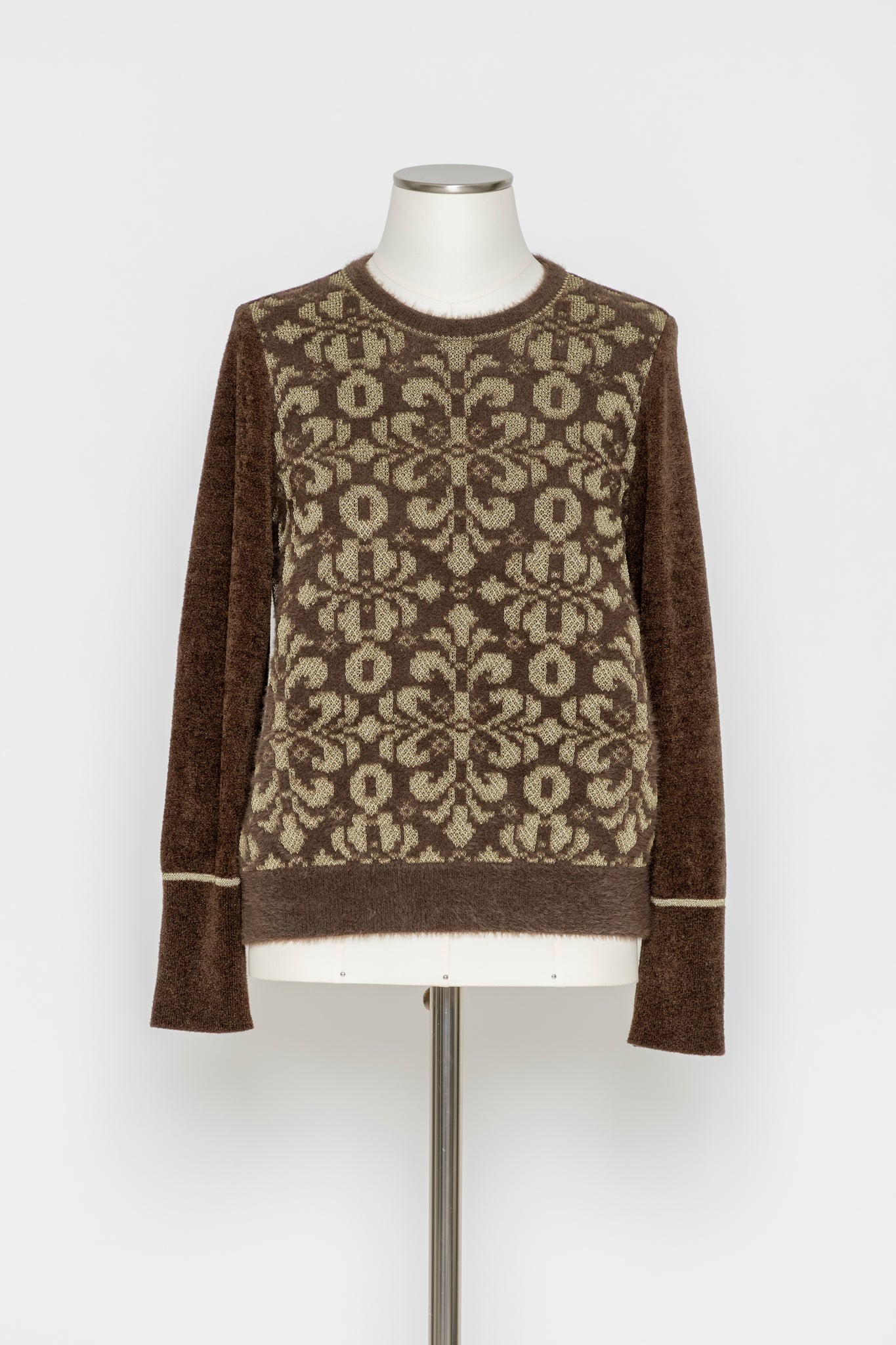 デザインの特徴:フロント全面にクラシカルなジャカード柄をあしらった印象的なニットプルオーバー。ラメのさりげない輝きが、奥行きのある表情を演出します。袖や後ろ身頃は無地で切り替え、すっきりとしたバランスに仕上げました。
