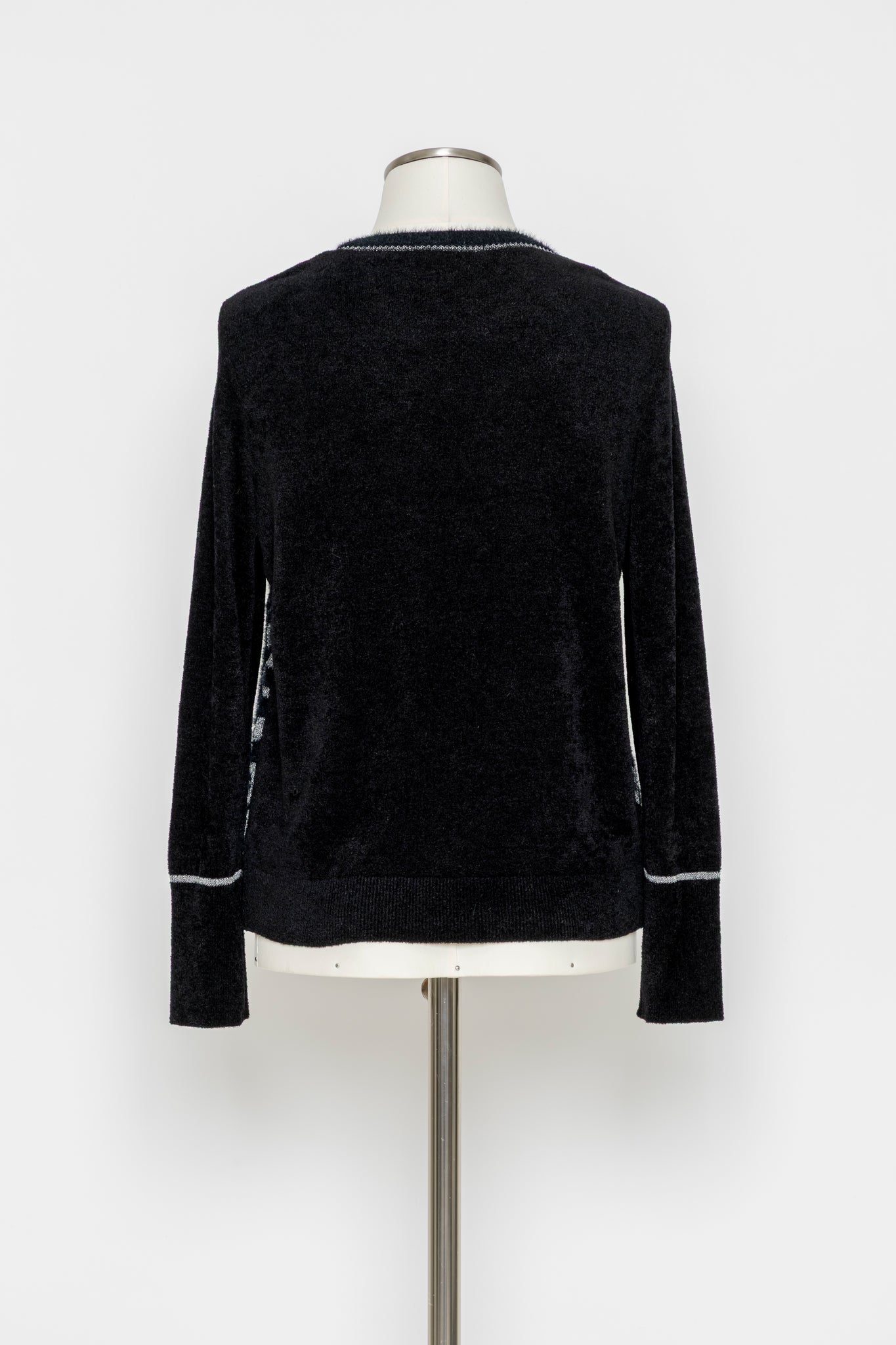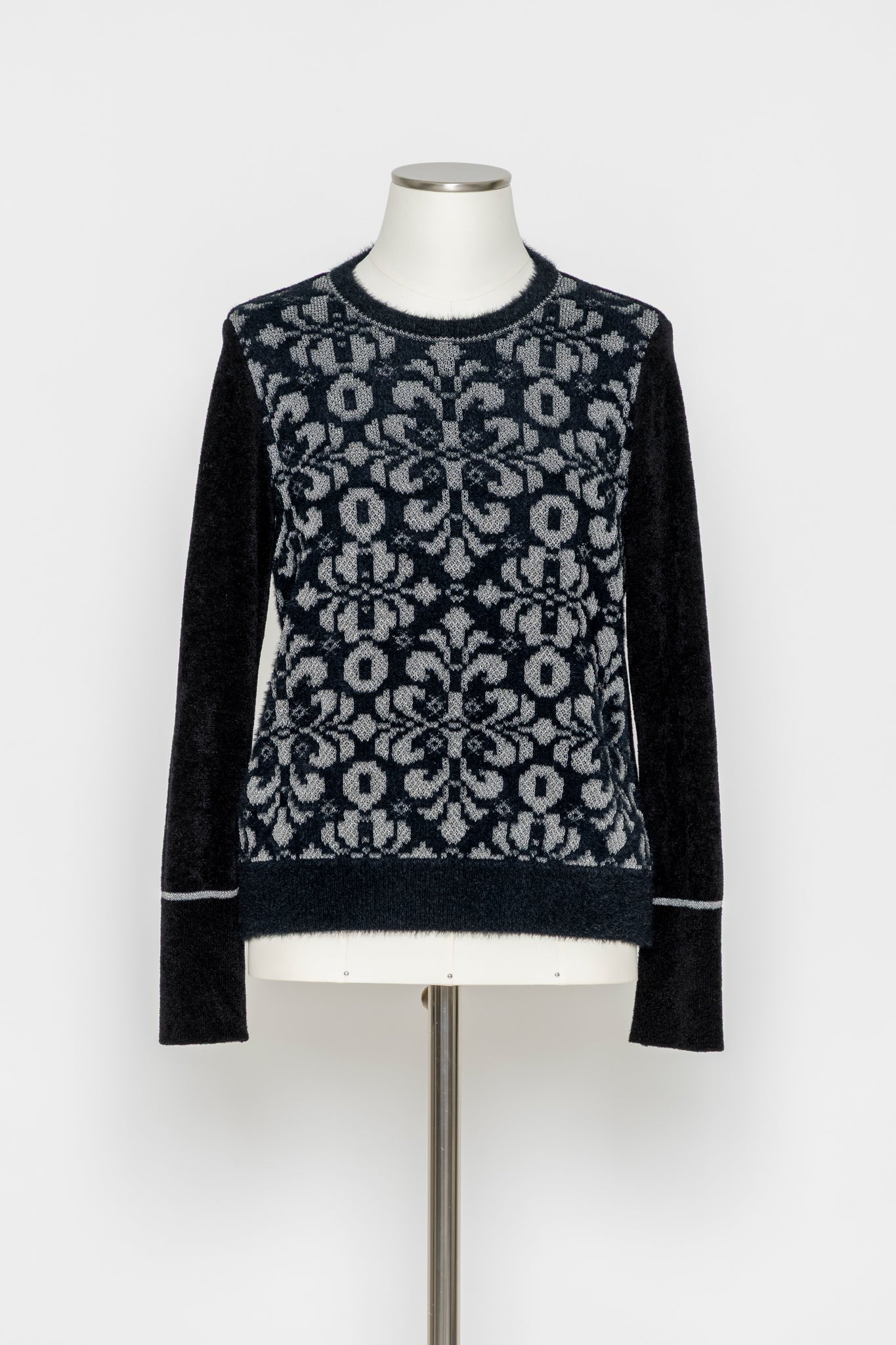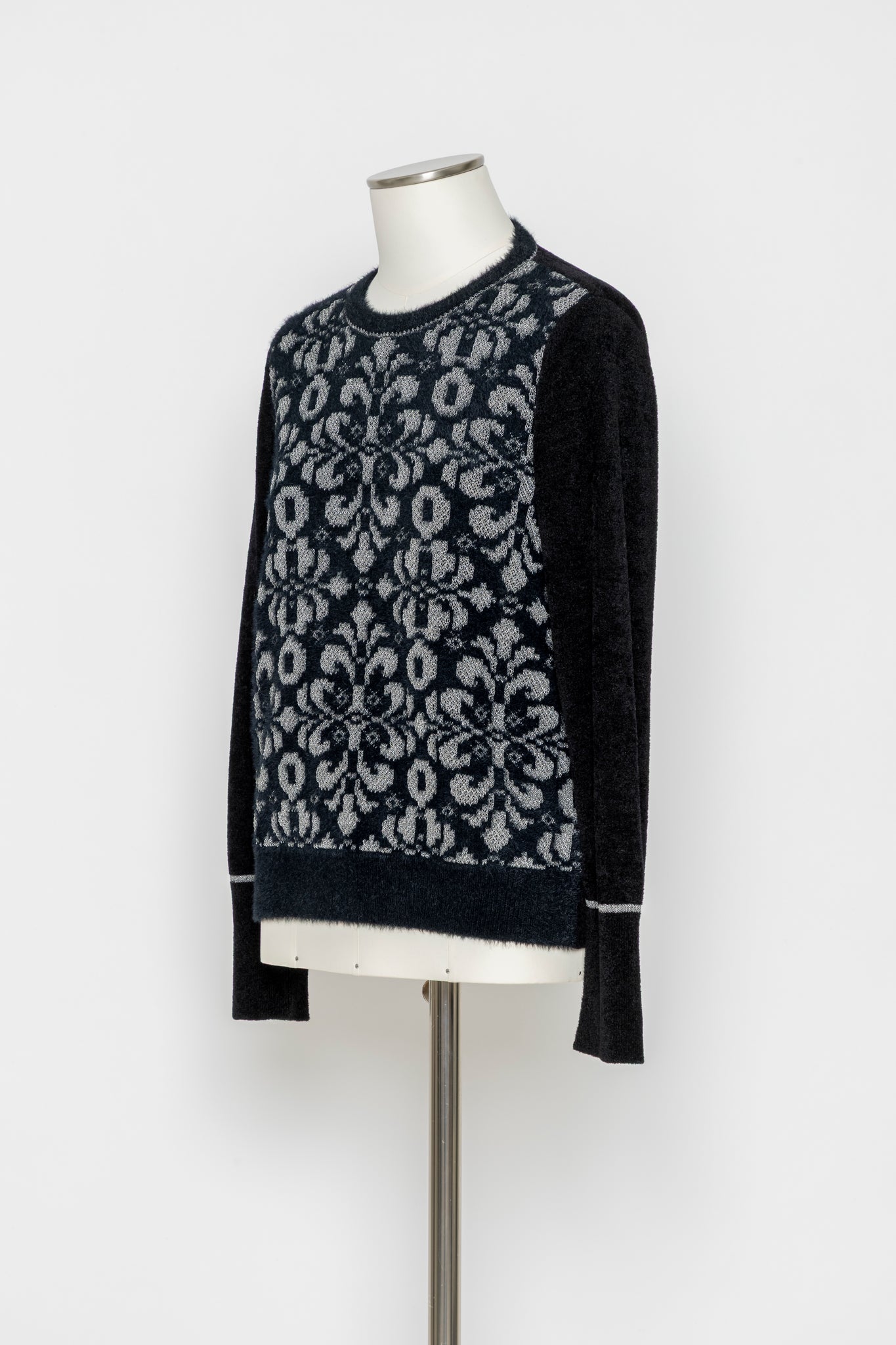 デザインの特徴:フロント全面にクラシカルなジャカード柄をあしらった印象的なニットプルオーバー。ラメのさりげない輝きが、奥行きのある表情を演出します。袖や後ろ身頃は無地で切り替え、すっきりとしたバランスに仕上げました。