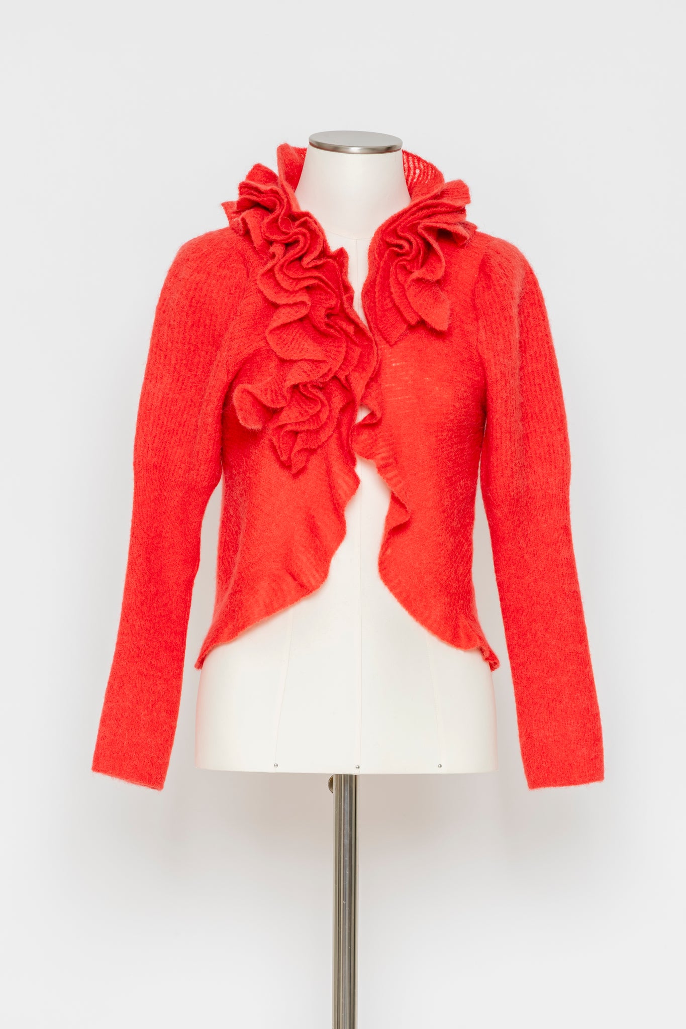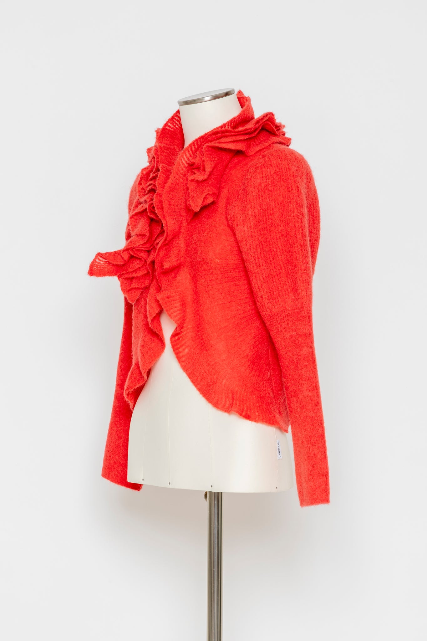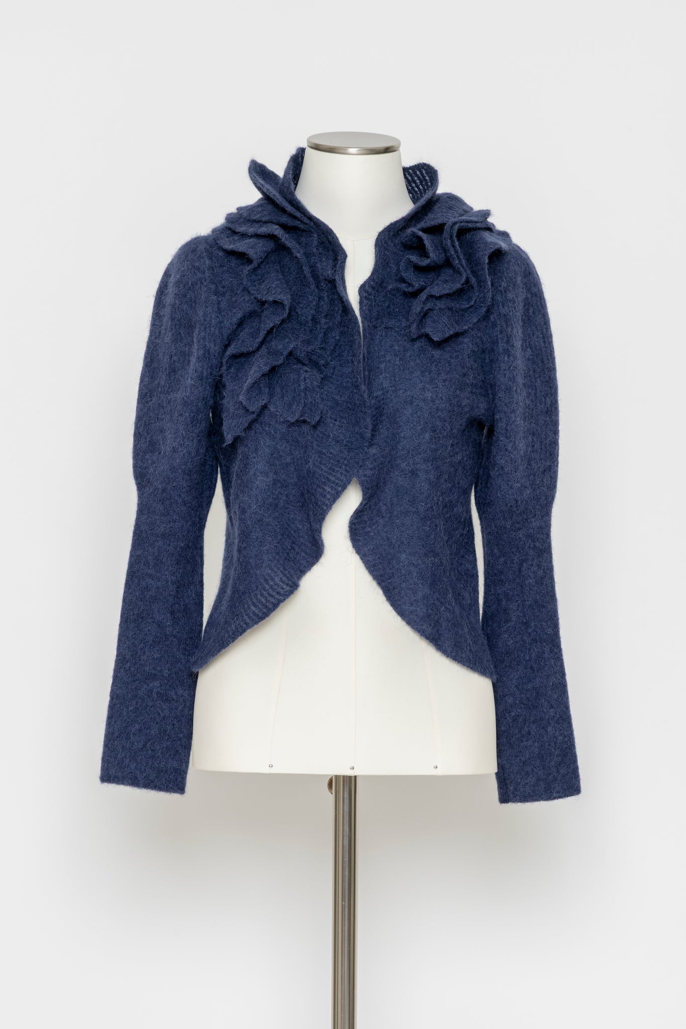 デザインの特徴:フロントに大胆に施されたフリルが華やかさを演出するジャケット。立体的なディテールが顔まわりを明るく見せ、女性らしさを引き立てます。程よい丈感とウエストラインに沿うシルエットで、スタイルアップ効果も。
