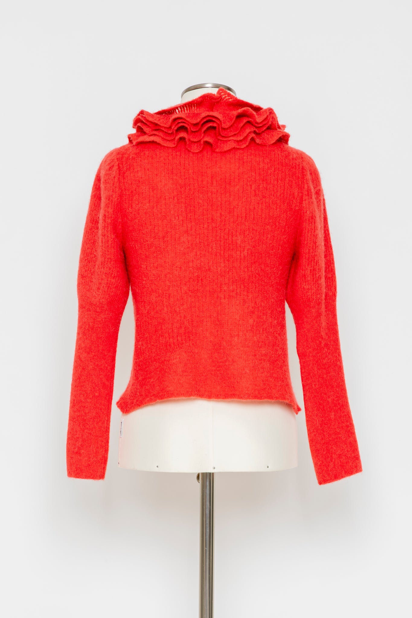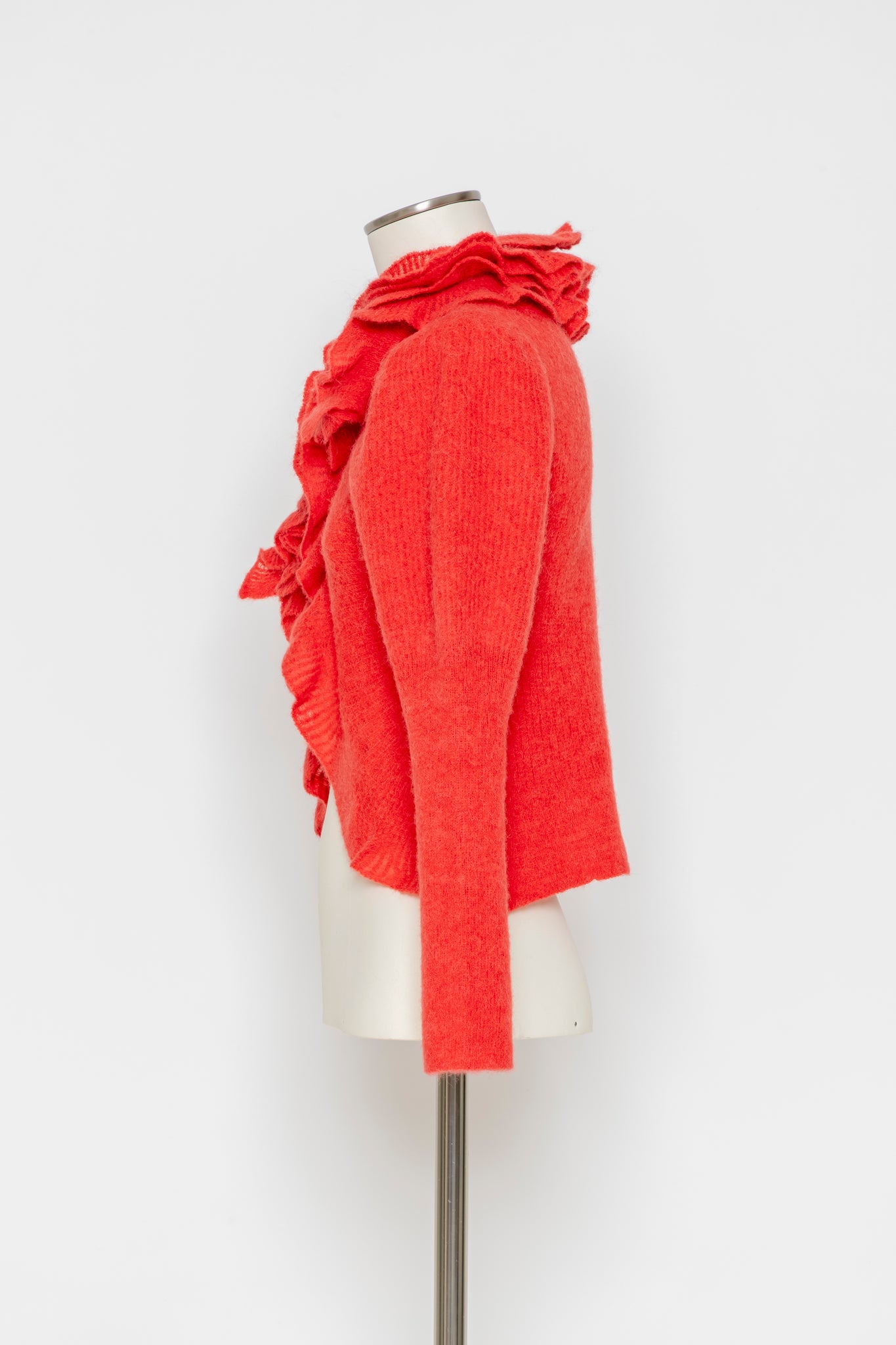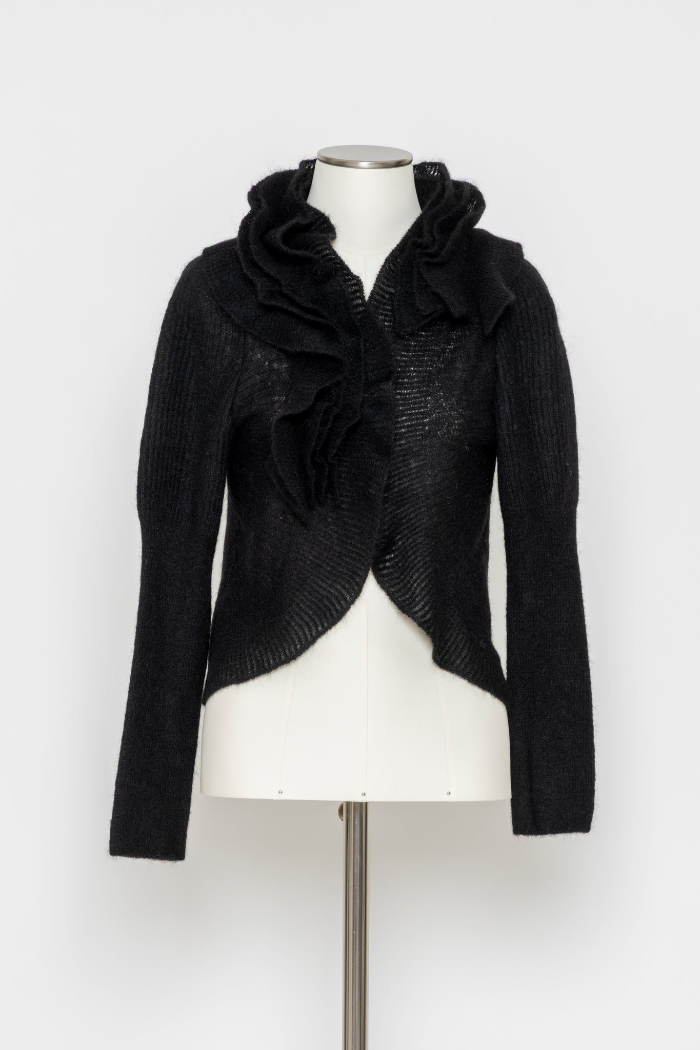 デザインの特徴:フロントに大胆に施されたフリルが華やかさを演出するジャケット。立体的なディテールが顔まわりを明るく見せ、女性らしさを引き立てます。程よい丈感とウエストラインに沿うシルエットで、スタイルアップ効果も。