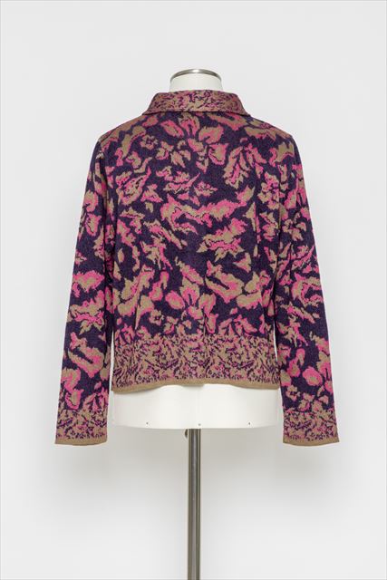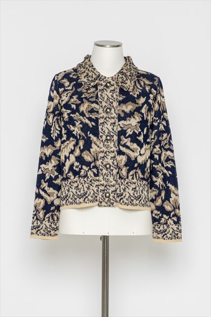 デザインの特徴:大胆なリーフモチーフを全体に散りばめた、存在感あるジャカード柄が印象的。クラシカルな襟付きデザインと、ゴールド調ボタンがアクセントとなり、上品でエレガントな雰囲気を引き立てます。コンパクトなシルエットながらも動きやすさを意識したパターンで仕立てています。