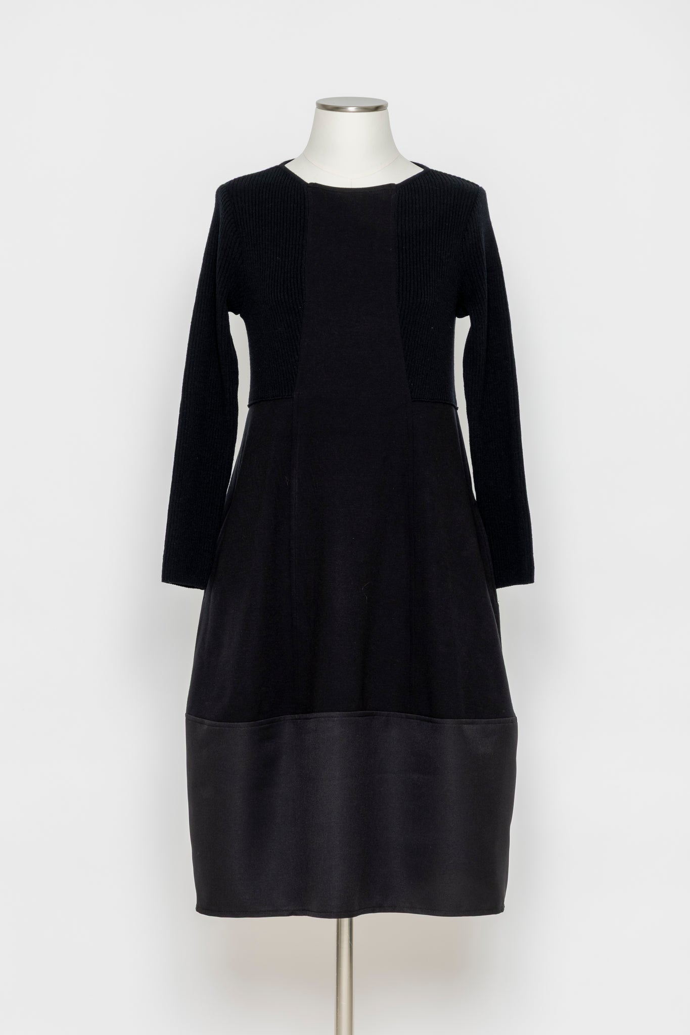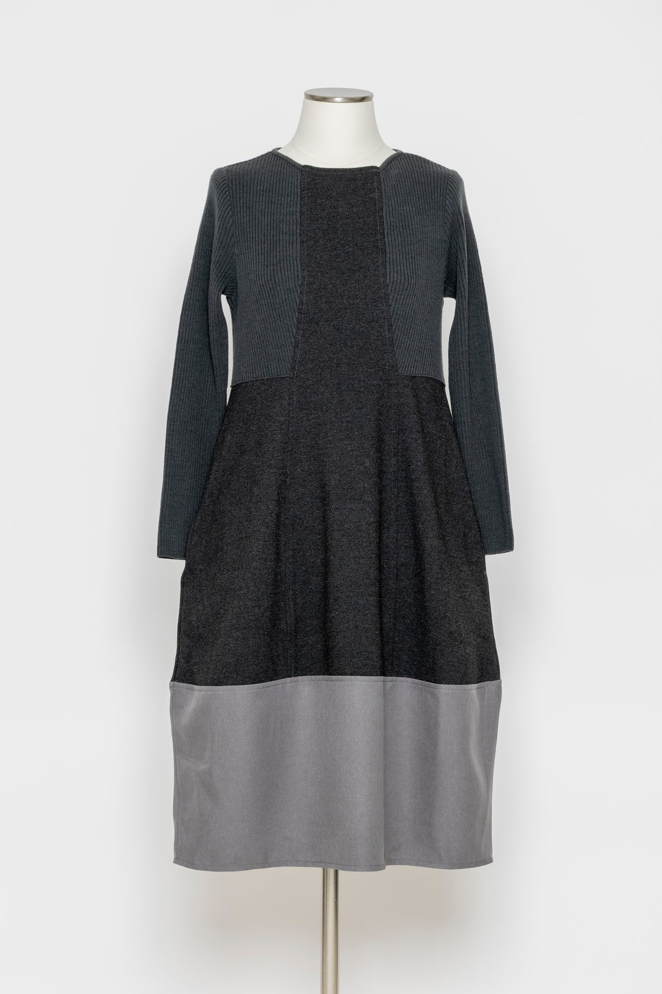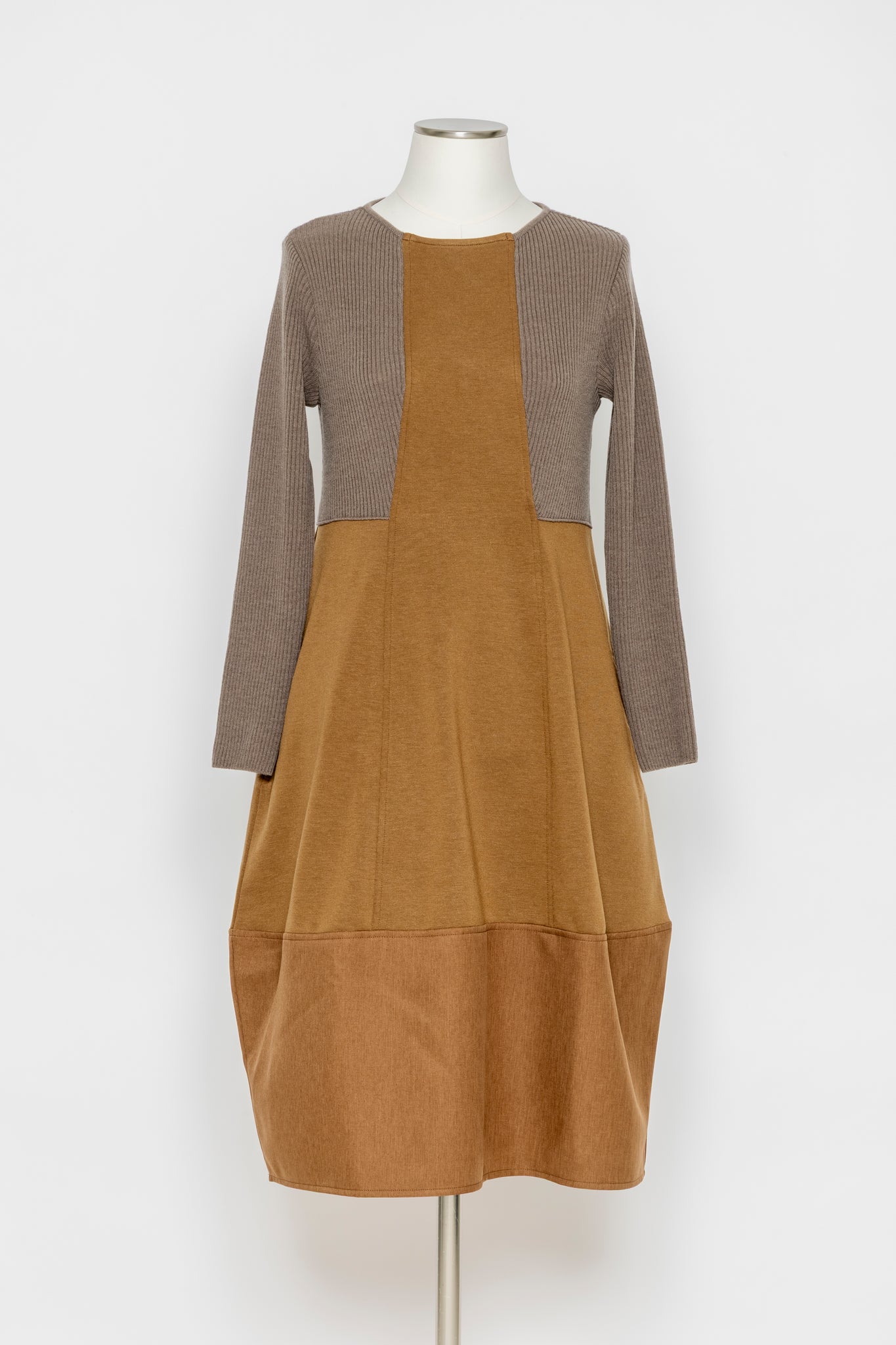 リブニットと布帛を切り替えた、立体感のあるデザインワンピース。上身頃はリブニットで程よいフィット感を出しつつ、スカート部分は布帛で広がりすぎないAラインに仕上げました。切り替えの配置が縦のラインを強調し、スタイルアップ効果も期待できます。