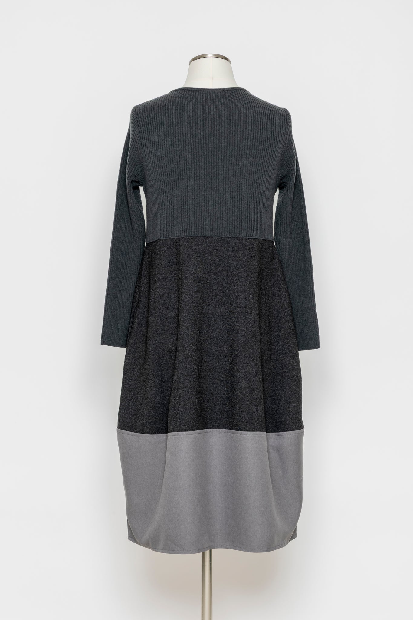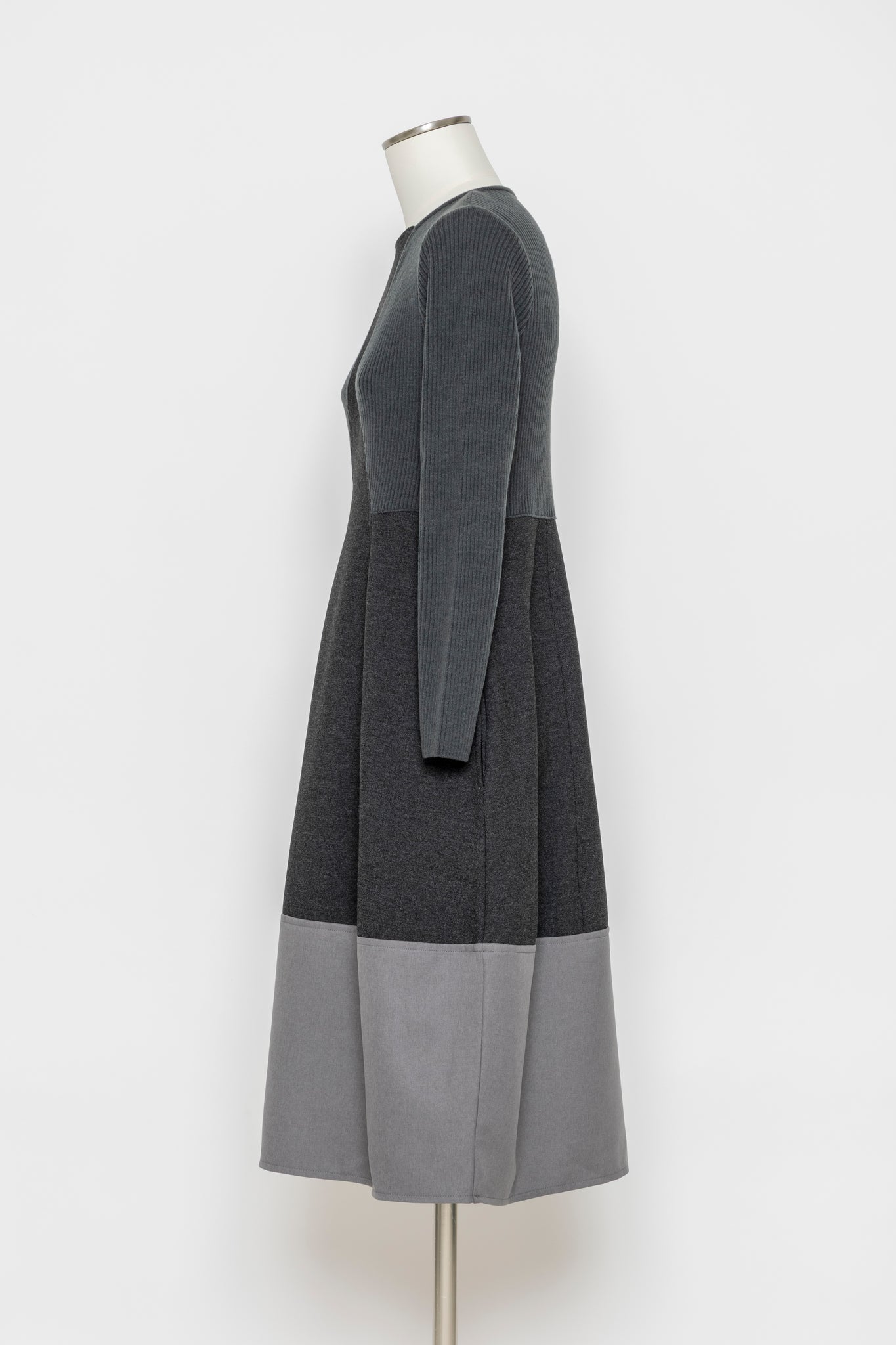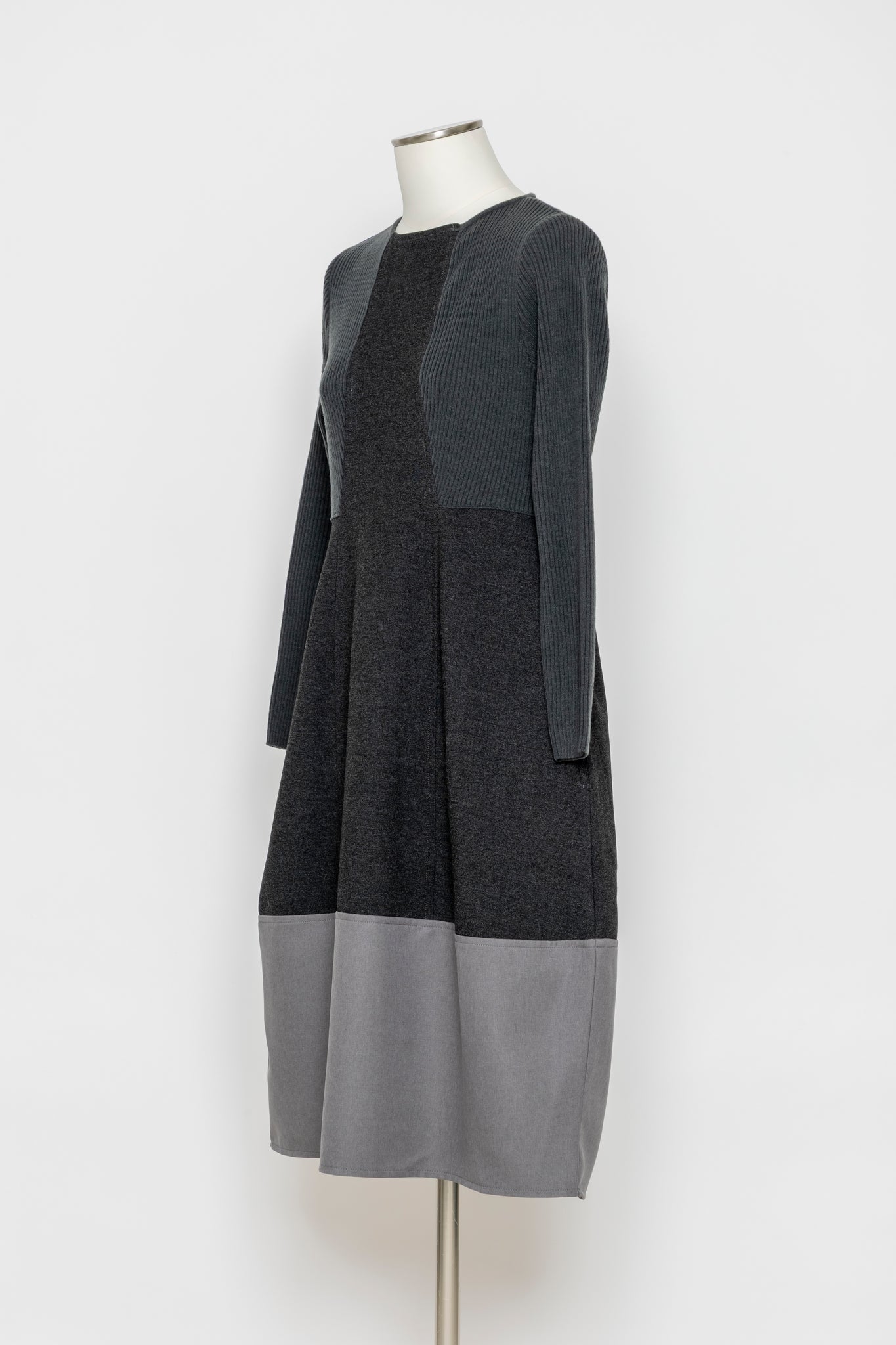 リブニットと布帛を切り替えた、立体感のあるデザインワンピース。上身頃はリブニットで程よいフィット感を出しつつ、スカート部分は布帛で広がりすぎないAラインに仕上げました。切り替えの配置が縦のラインを強調し、スタイルアップ効果も期待できます。