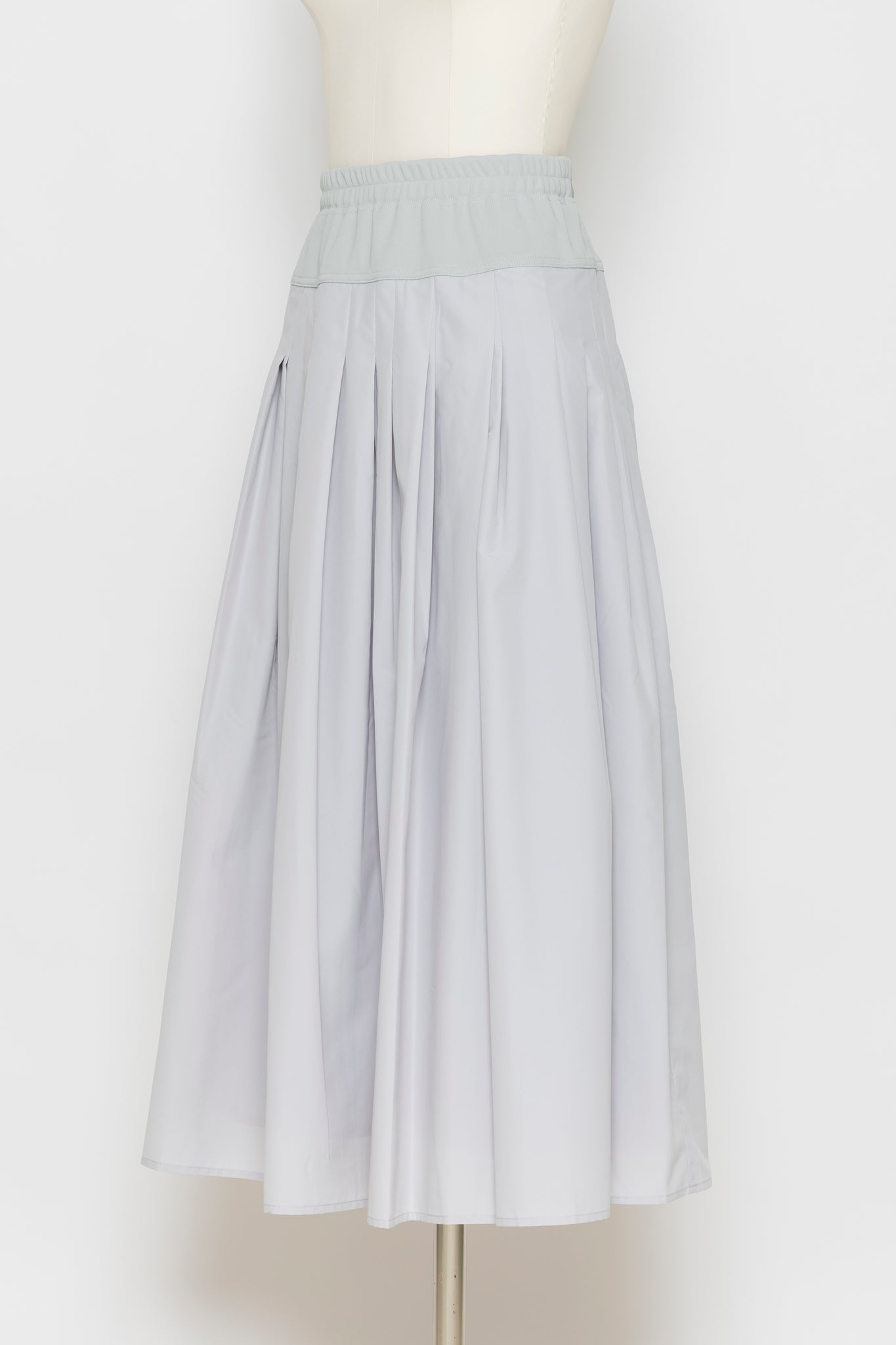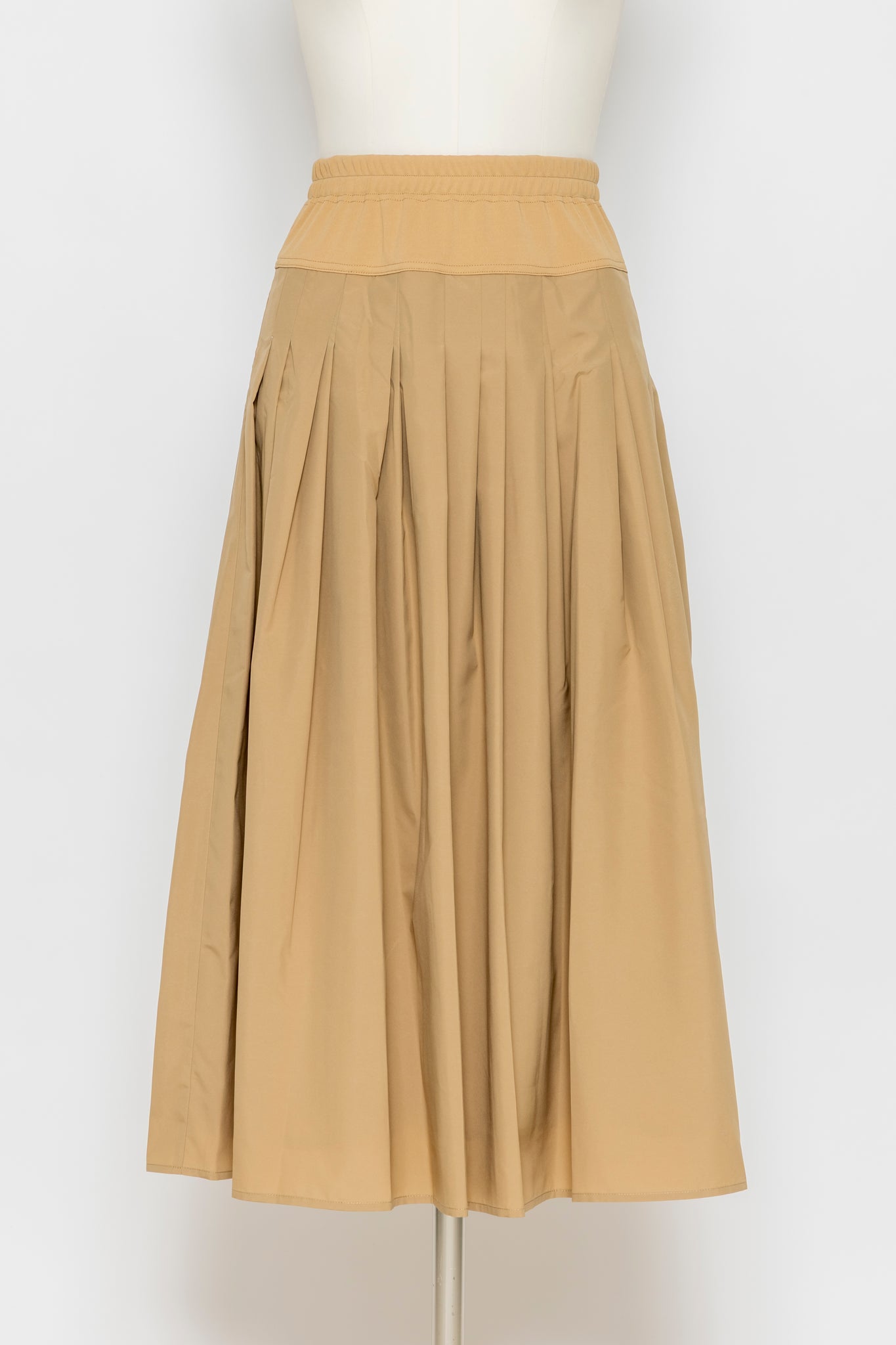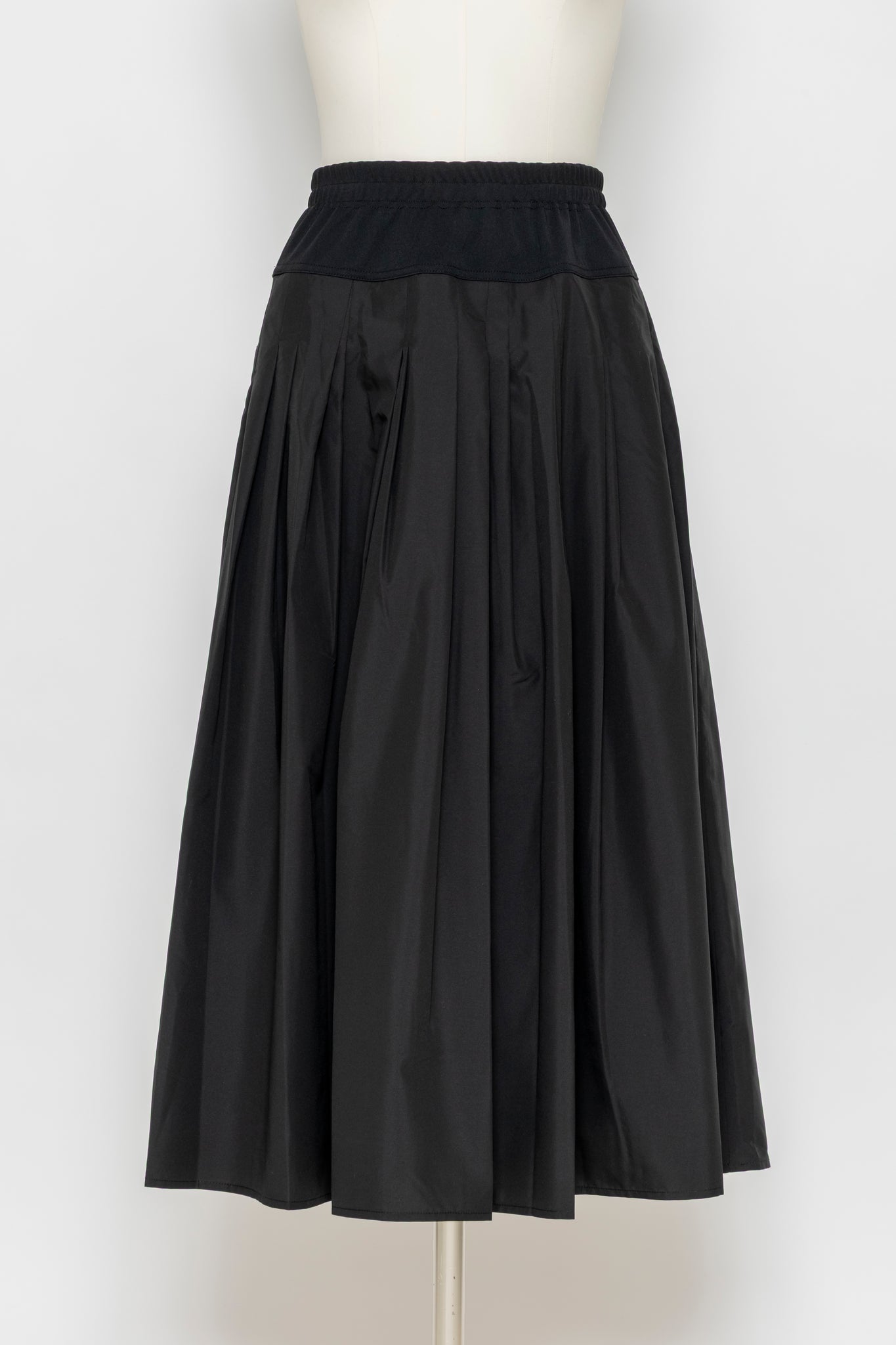 デザインの特徴:軽やかなポリエステル素材を使用したミディ丈スカート。ウエスト部分にはカットソー素材を切り替え、快適なフィット感を実現しました。フロントから広がるタックが立体感を生み、動くたびに揺れる表情豊かなシルエットを演出します。裏地付きで透け感を気にせず安心して着用できるのも魅力です。