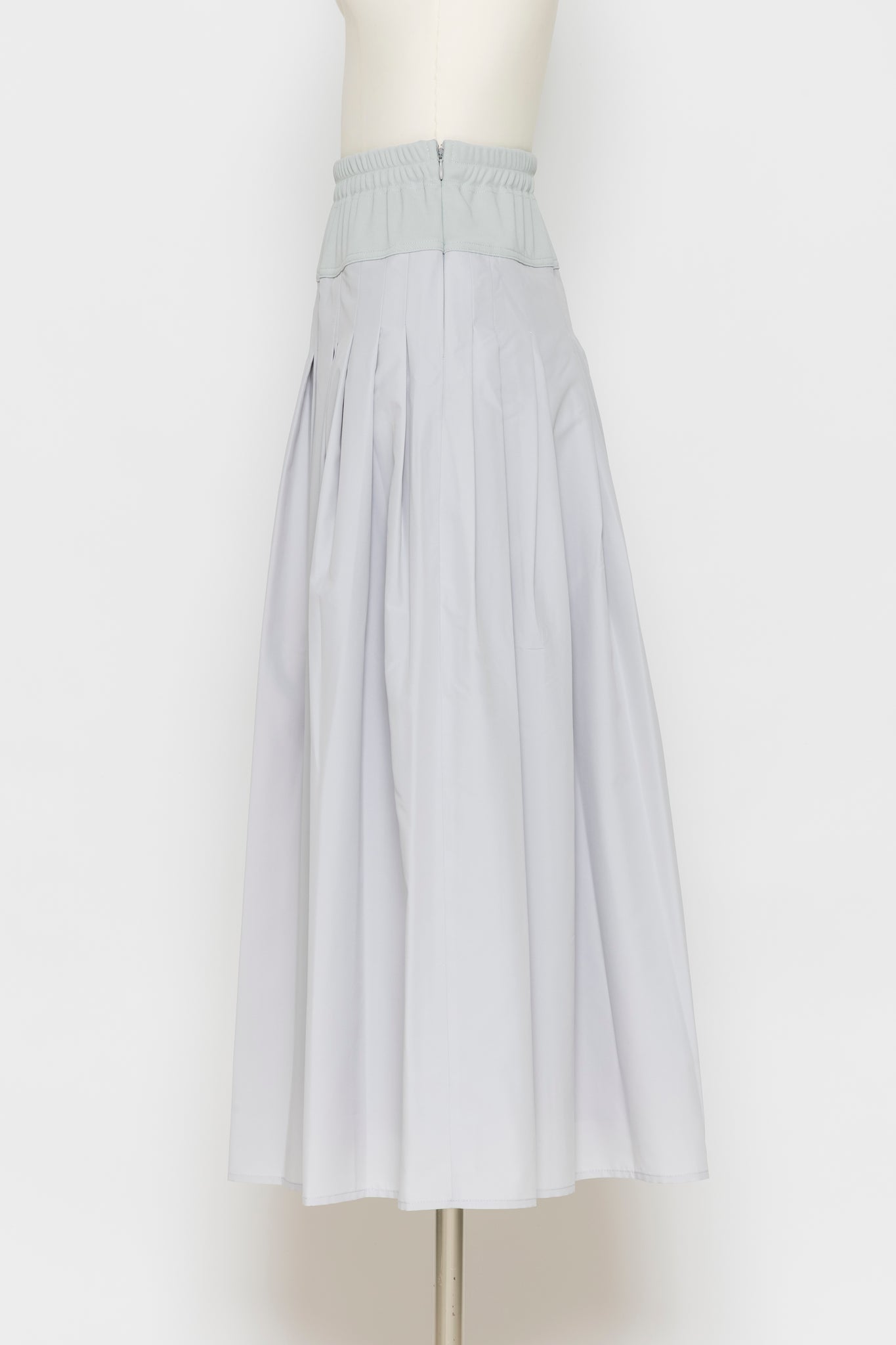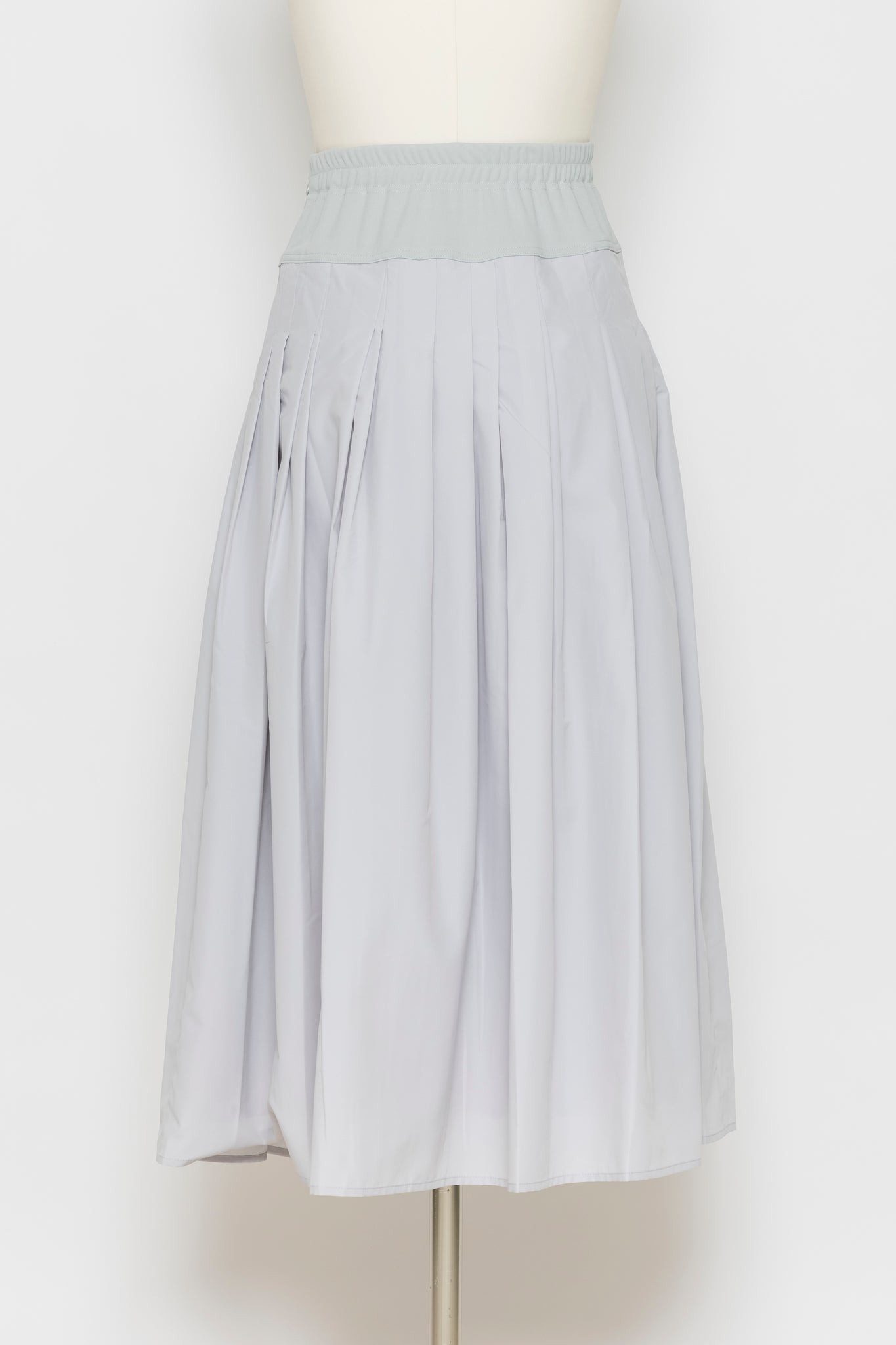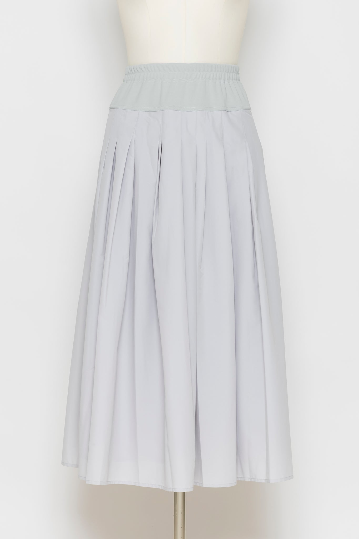 デザインの特徴:軽やかなポリエステル素材を使用したミディ丈スカート。ウエスト部分にはカットソー素材を切り替え、快適なフィット感を実現しました。フロントから広がるタックが立体感を生み、動くたびに揺れる表情豊かなシルエットを演出します。裏地付きで透け感を気にせず安心して着用できるのも魅力です。
