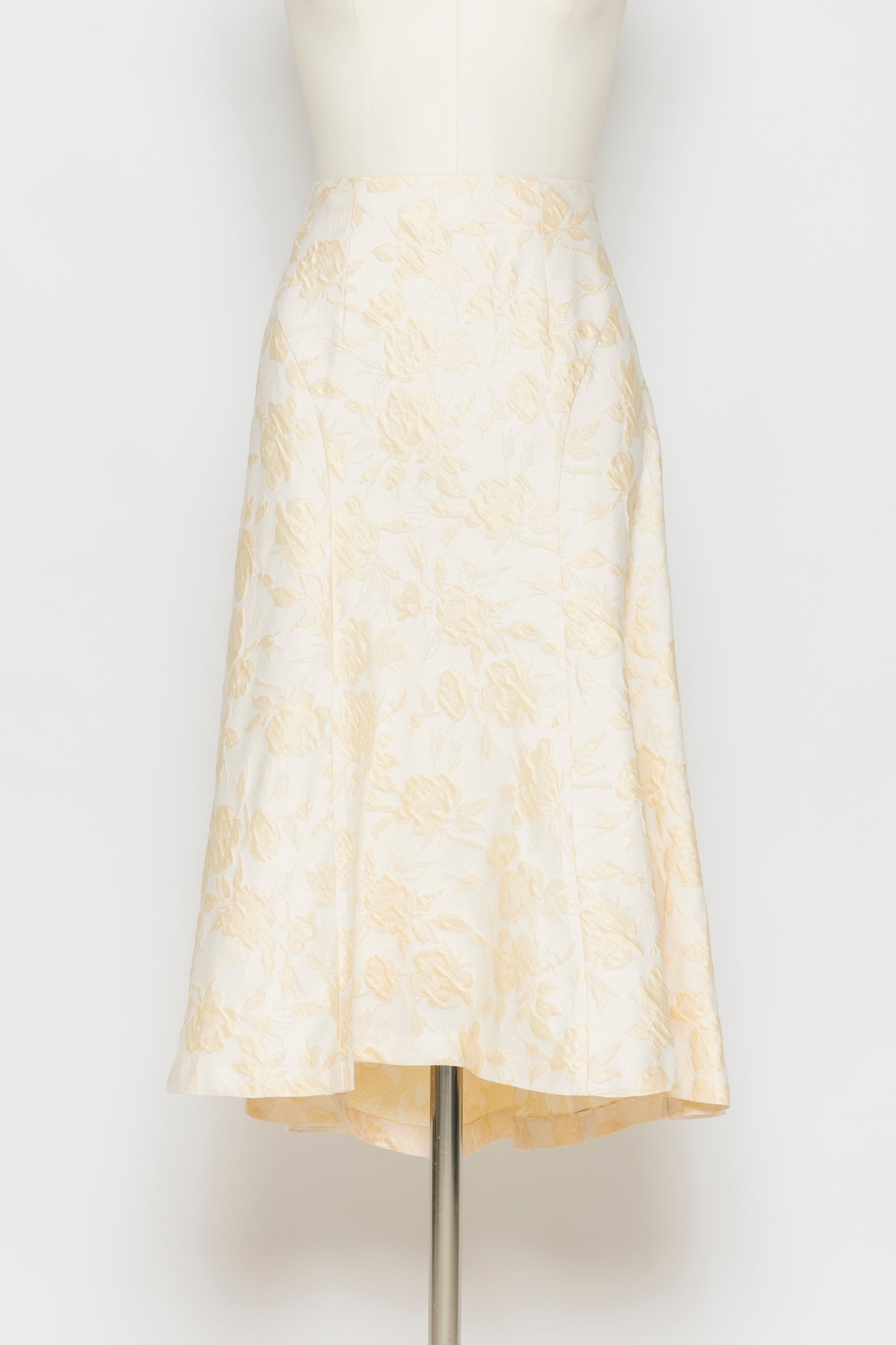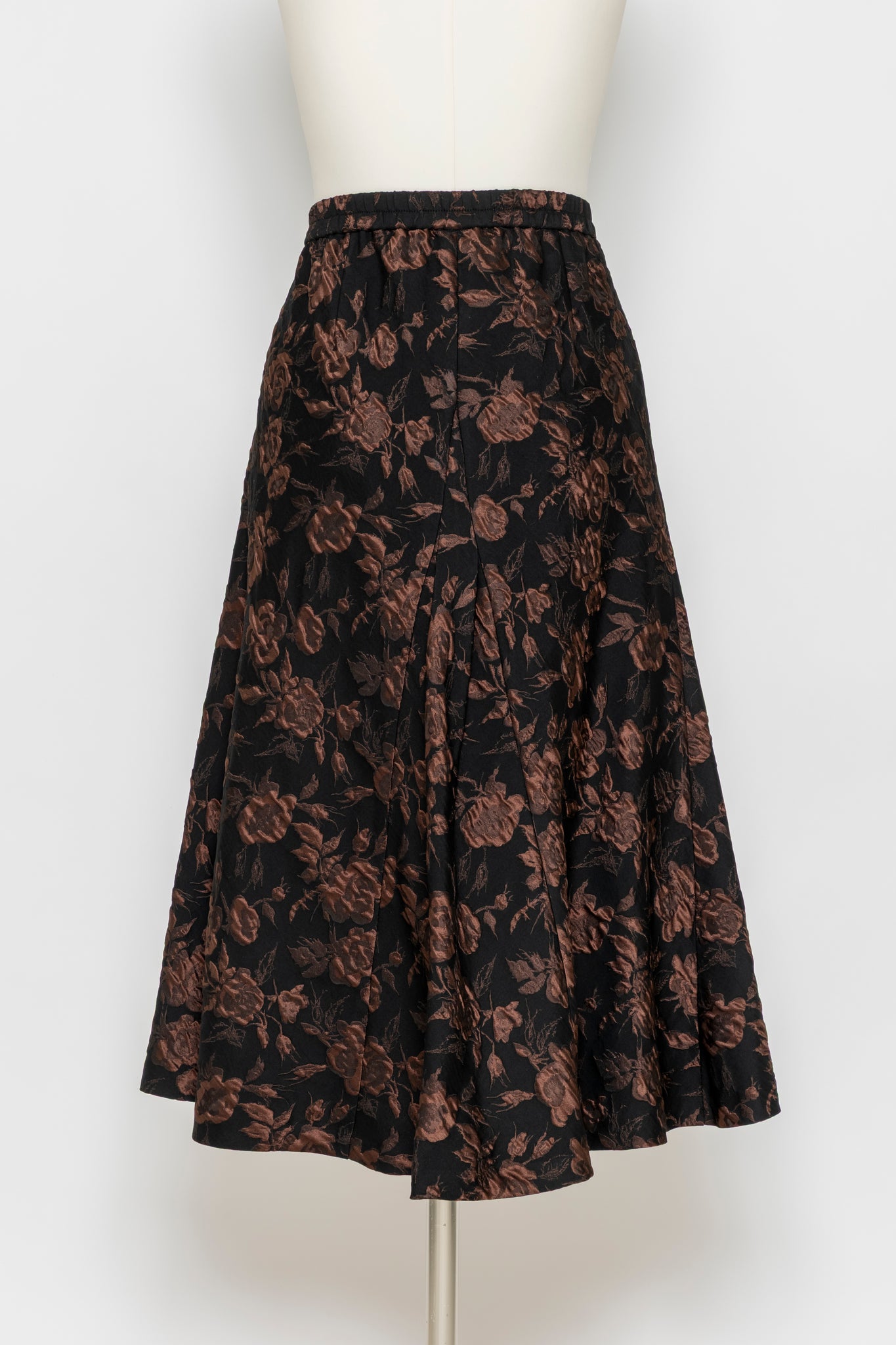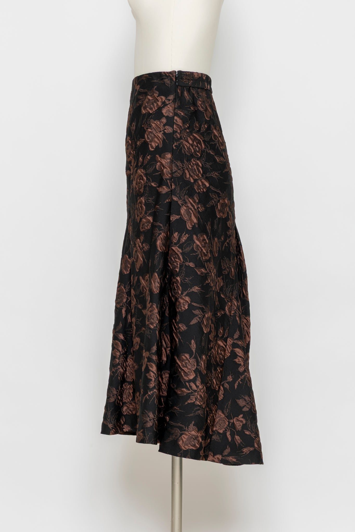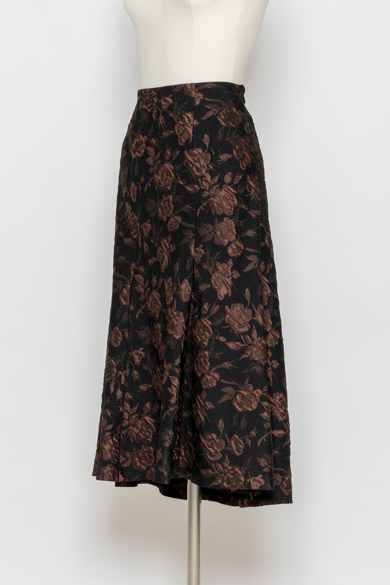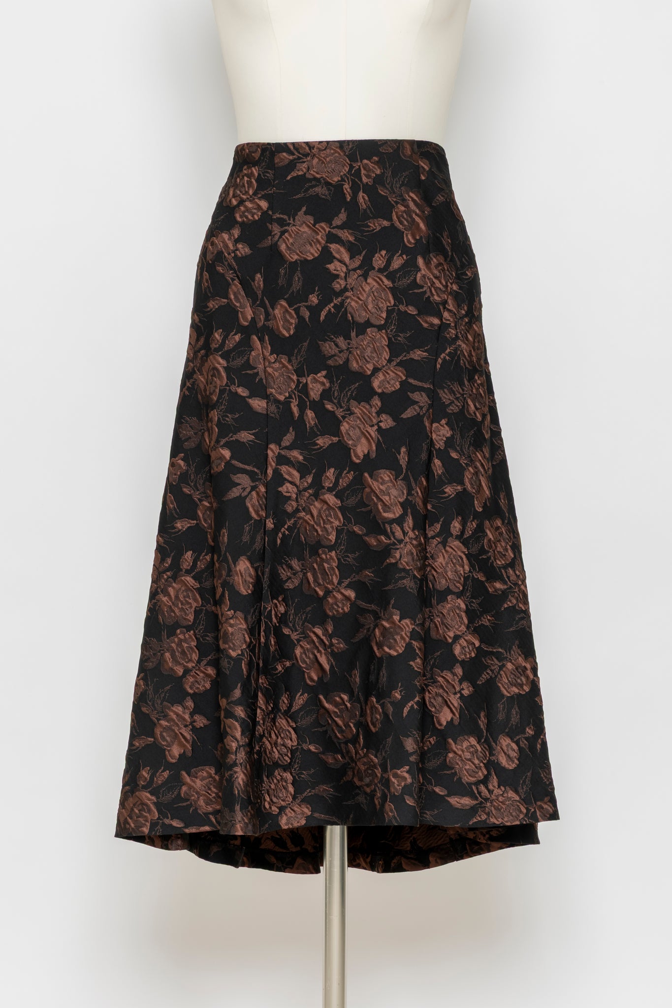 デザインの特徴:上品な花柄ジャカード生地を使用したフレアスカート。立体感のある織り柄が光の加減で美しく表情を変え、華やかさと気品を演出します。前後差をつけた裾ラインが軽やかな動きをプラスし、歩くたびに女性らしいシルエットを描きます。