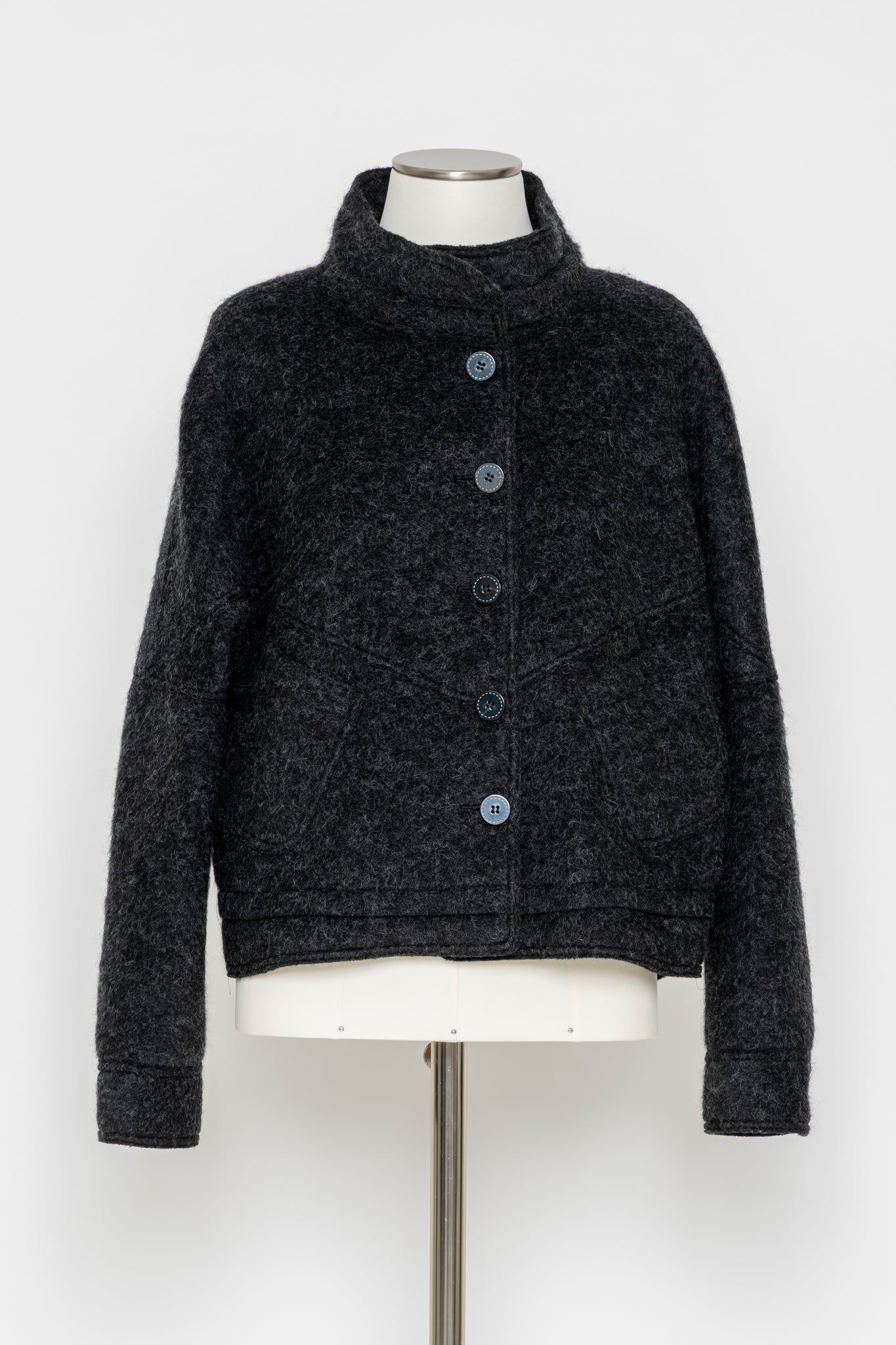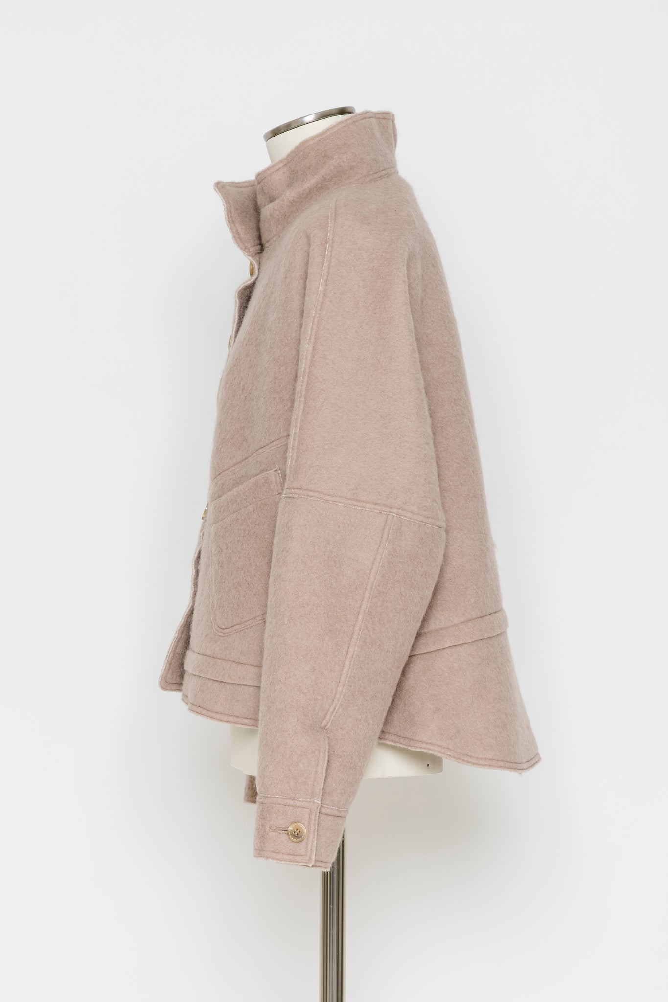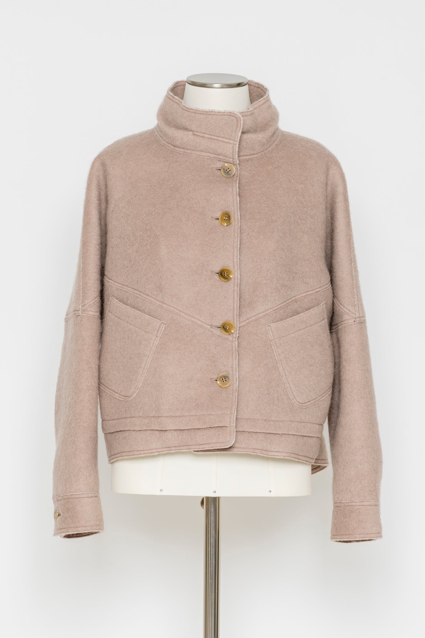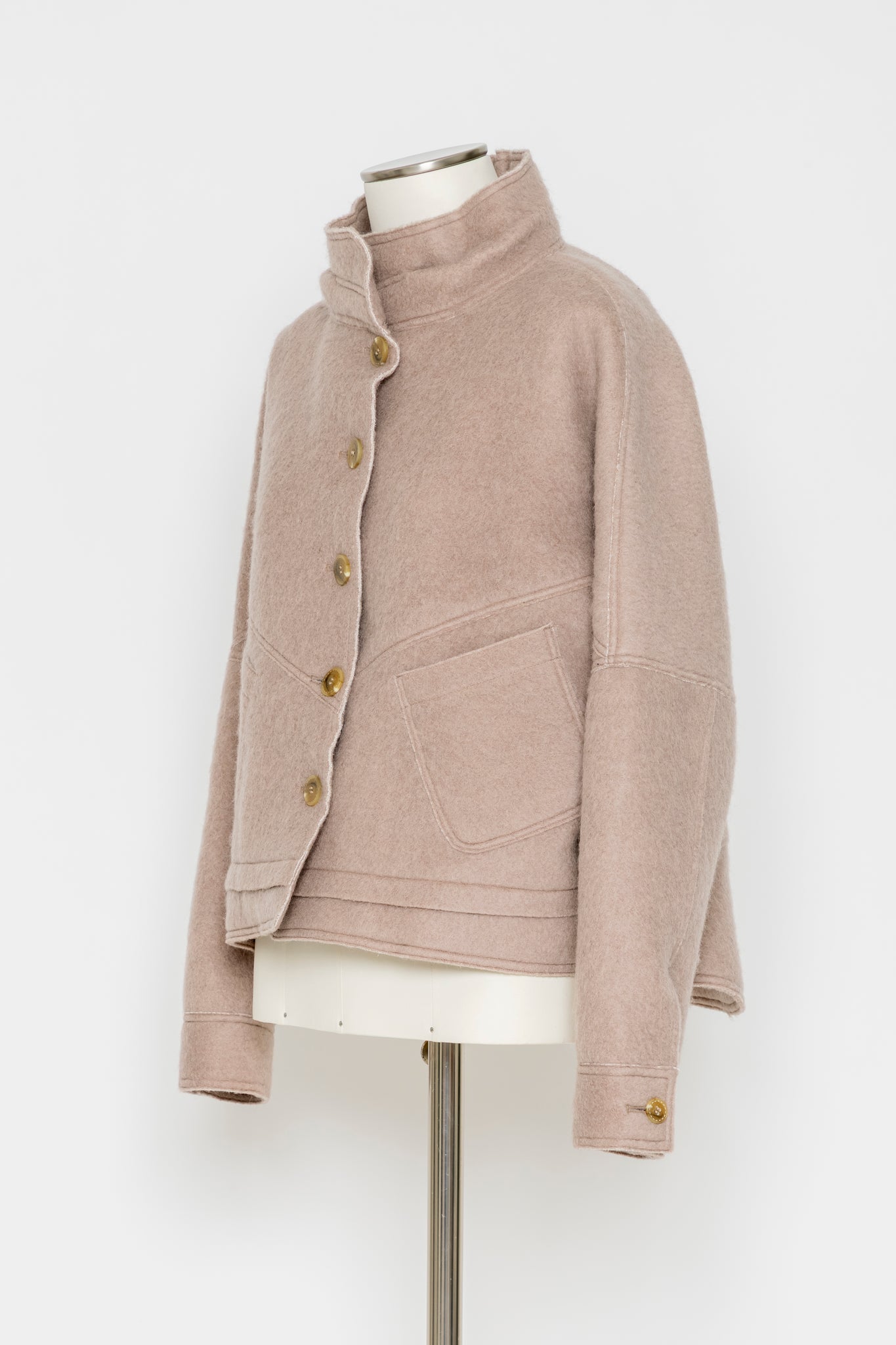 デザインの特徴:ふんわりとしたウールをソフトに圧縮した生地を使用したショートジャケットです。暖かみのある風合いと上品な表情が魅力。高めのスタンドカラーと大きめのボタンがアクセントとなり、シンプルながらも存在感を放つデザインです。コンパクトな丈感でバランスが取りやすく、後ろ下がりのラインがこなれ感を演出します。