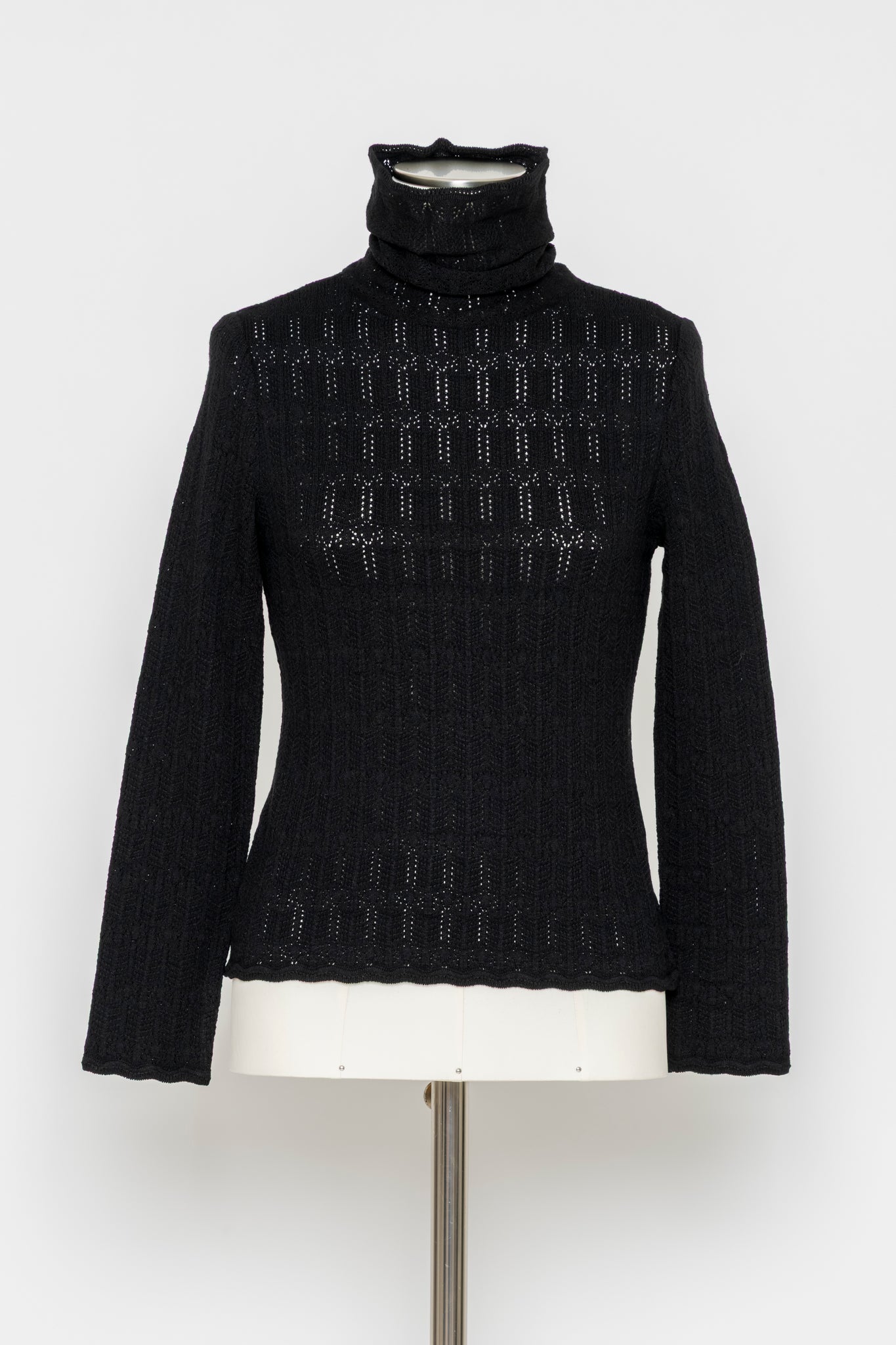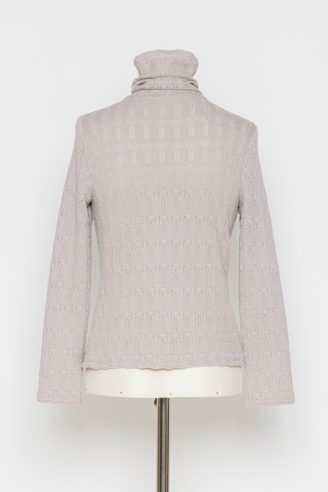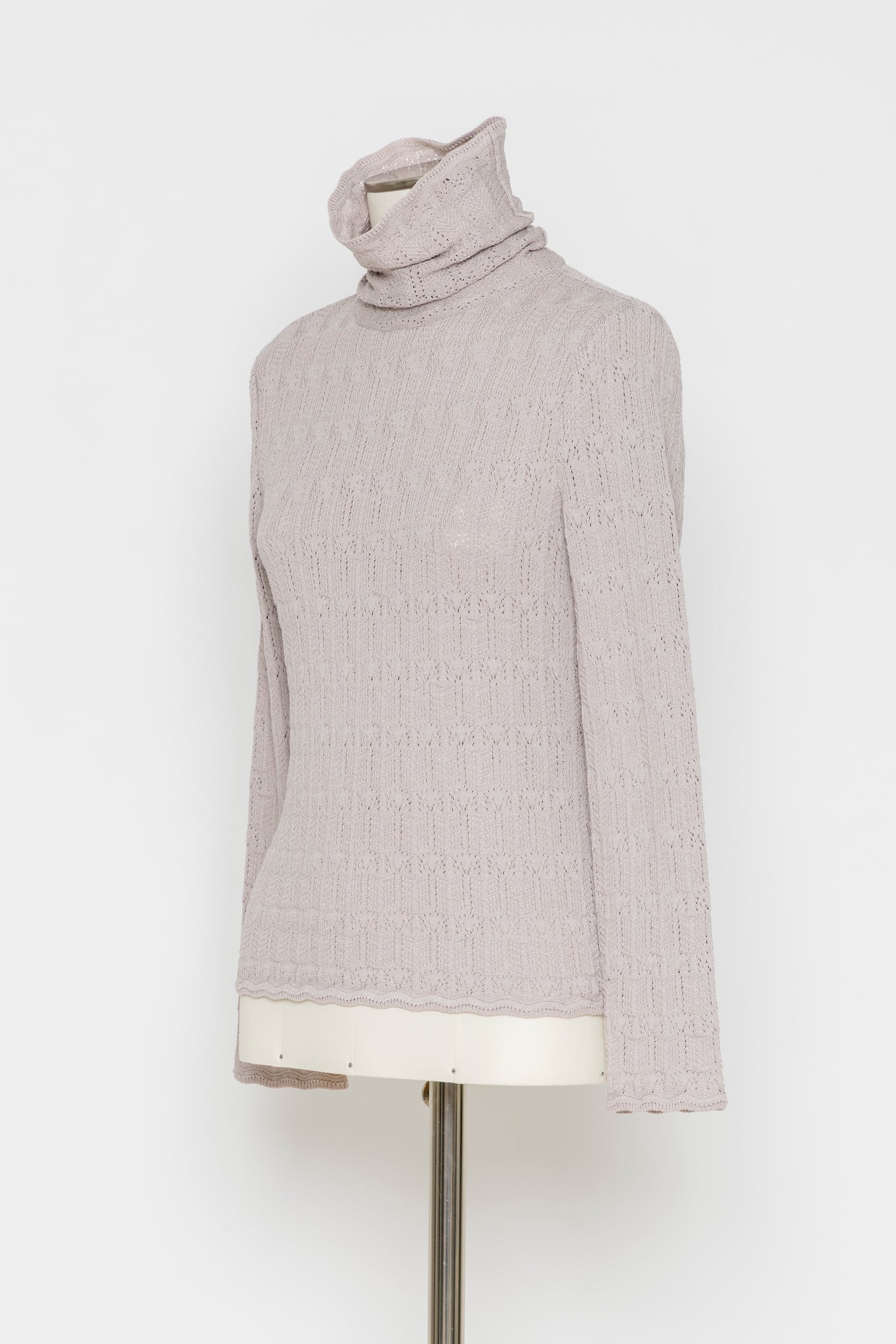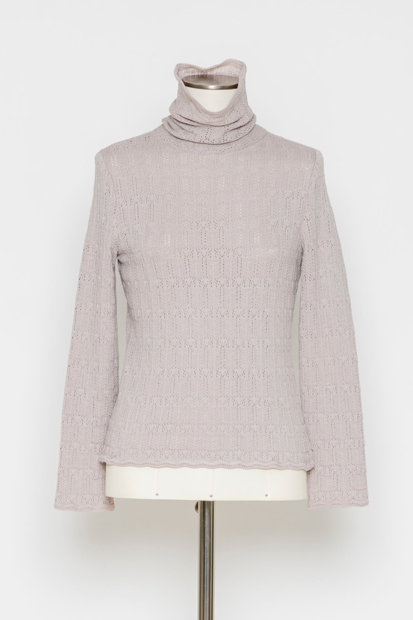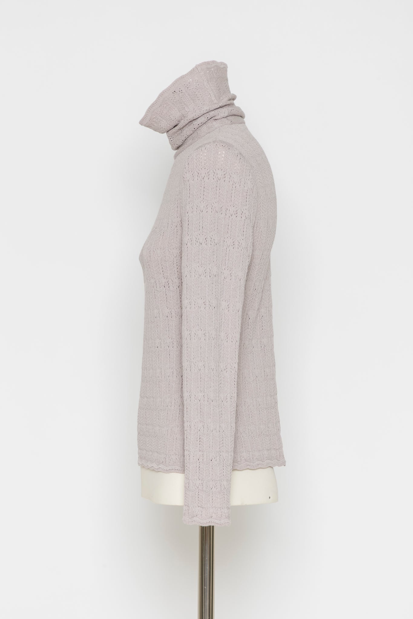 デザインの特徴:上品な透かし編み模様が施されたタートルネックニット。伸縮性に優れたレーヨンストレッチ素材を使用しており、体のラインに自然に沿う美しいシルエットを演出します。首元のタートル部分は柔らかく折り返すことで、リラックス感と立体感のある表情を楽しめます。袖口と裾にはさりげないスカラップ仕様を取り入れ、女性らしい雰囲気をプラスしました。