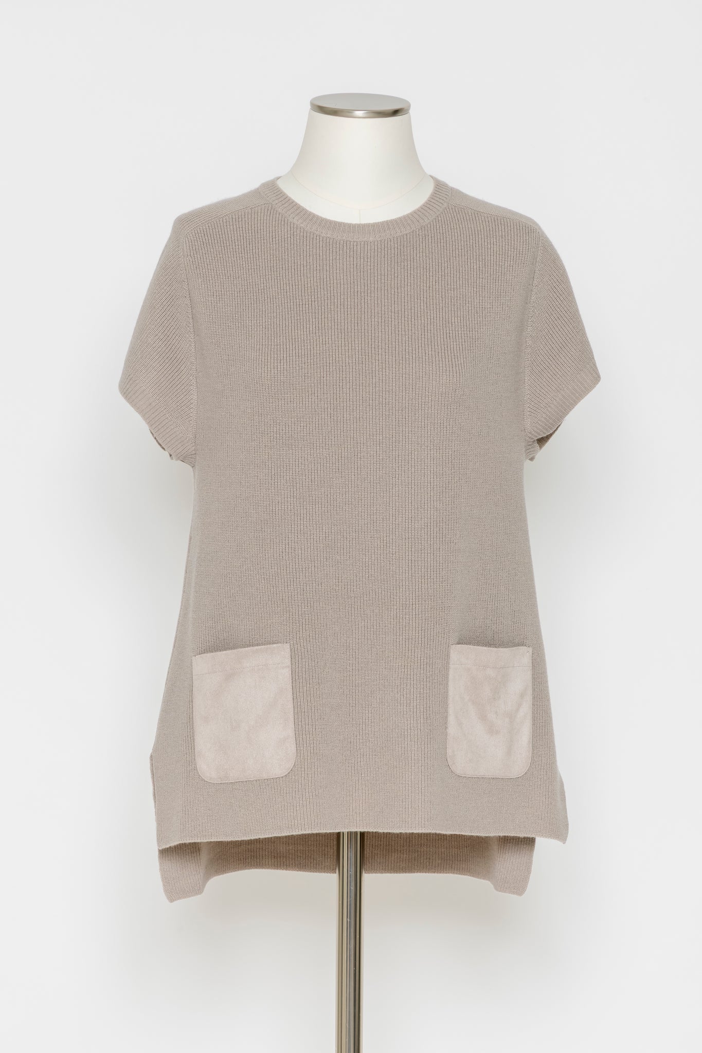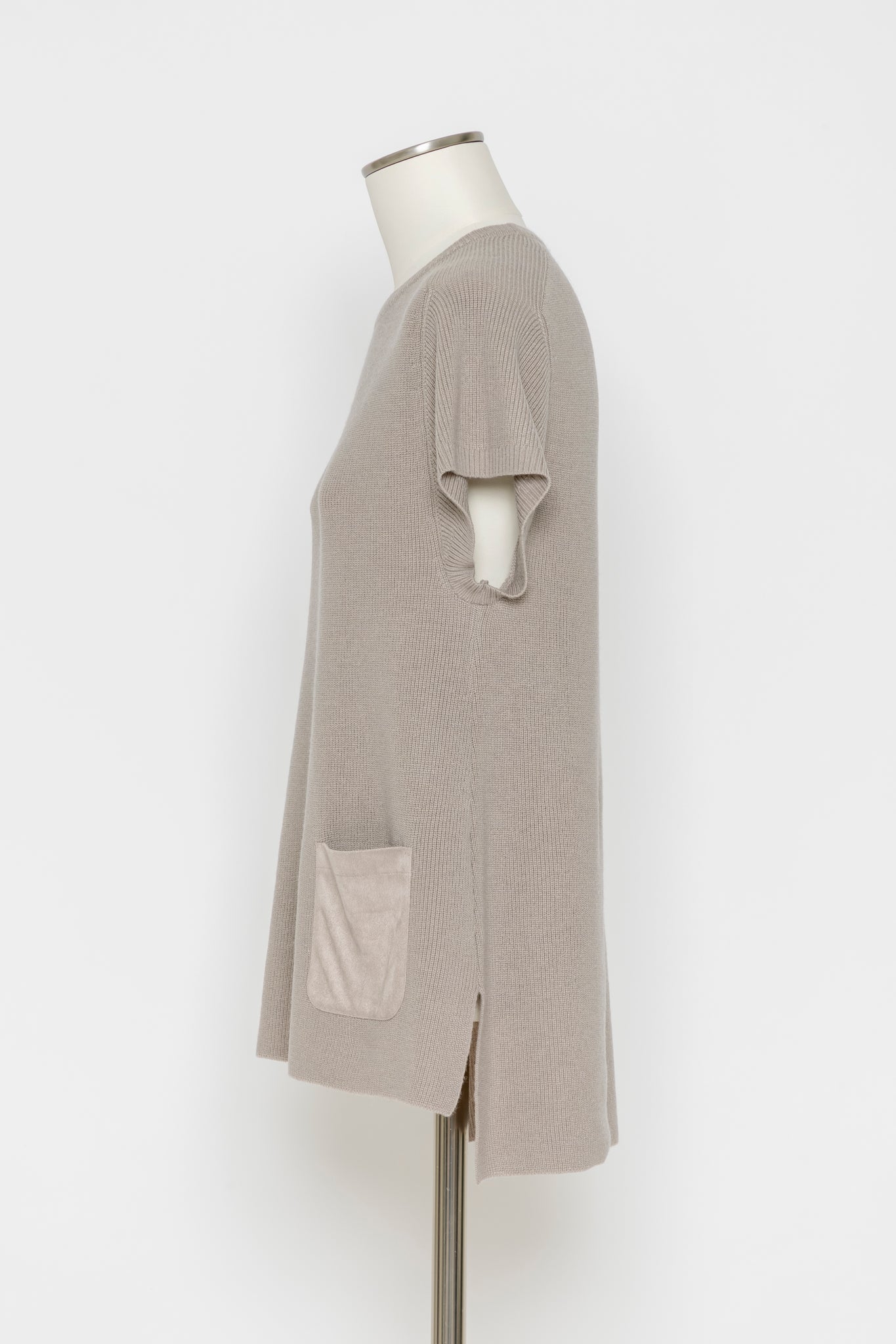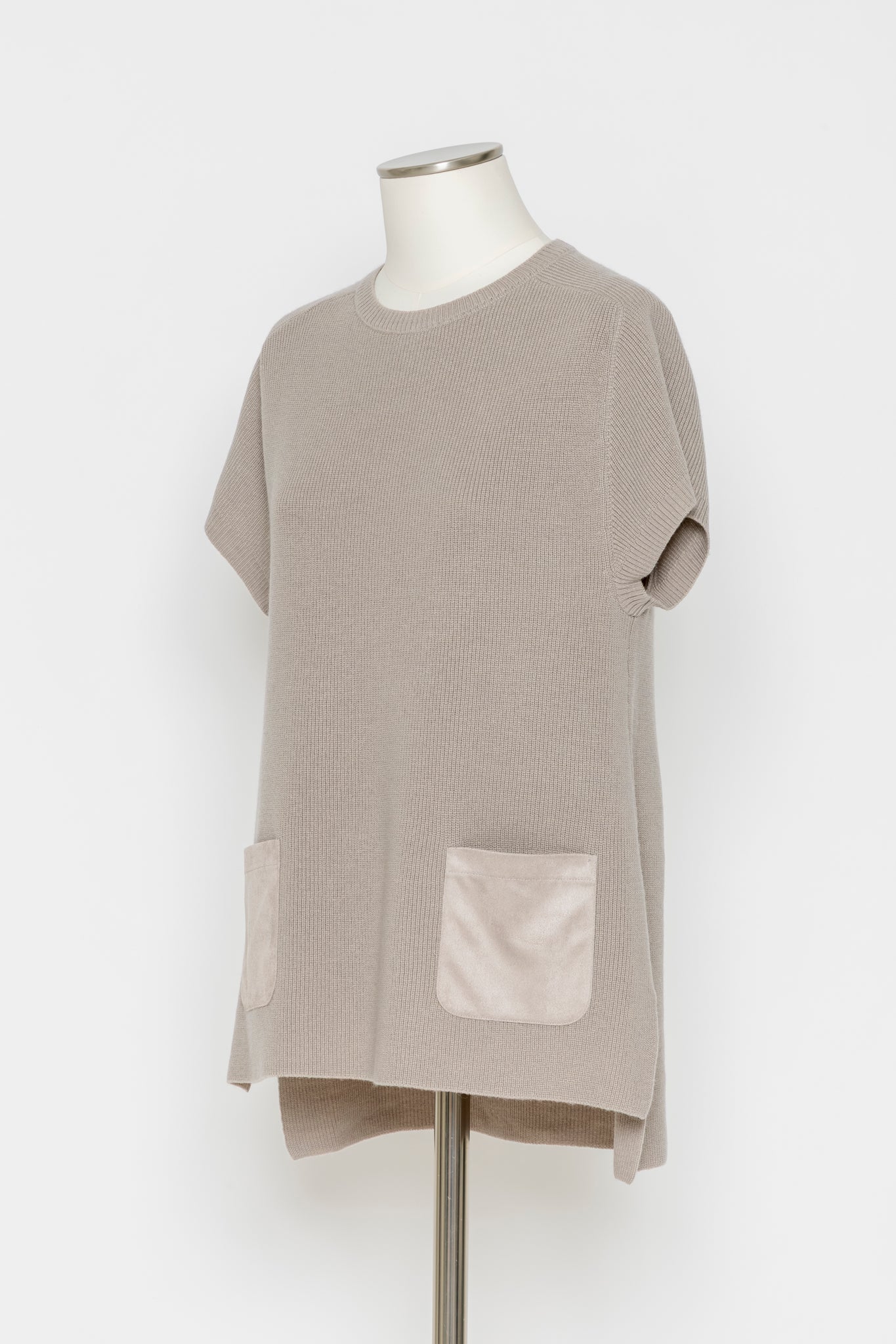 デザインの特徴:柔らかなニット素材をベースに、フロントのポケット部分に合成皮革ヌバック素材を組み合わせた異素材コンビデザイン。シンプルながらもアクセントの効いたディテールで、大人のカジュアルスタイルに洗練された印象をプラスします。程よいゆとりのあるシルエットで体型を選ばず、快適に着用できるのも魅力です。