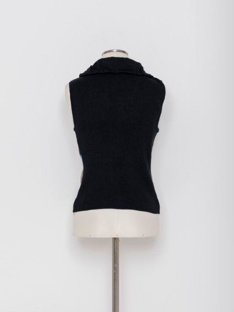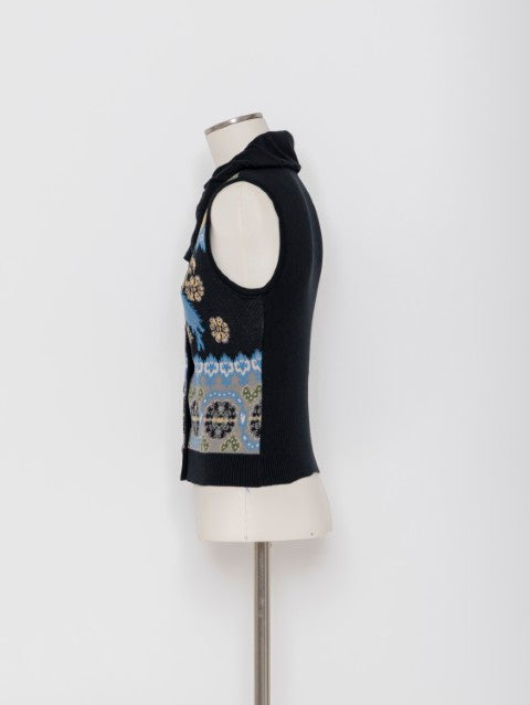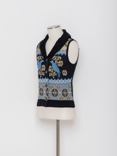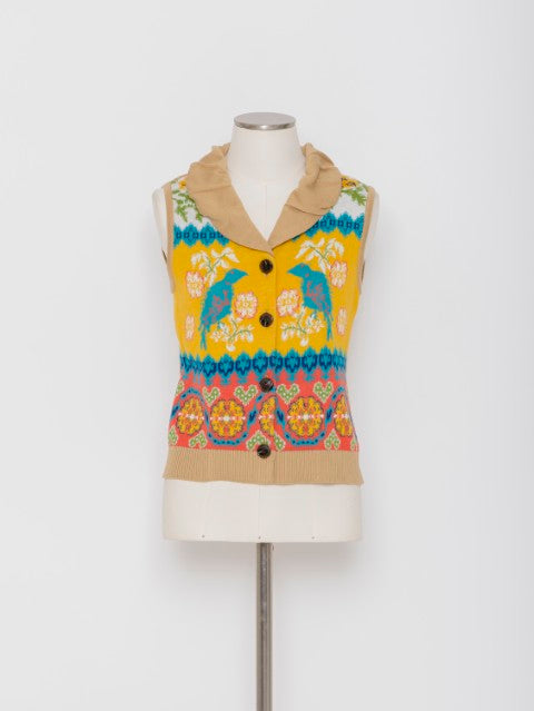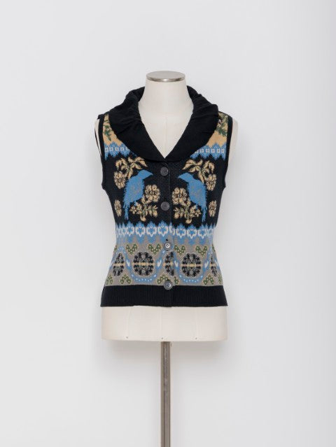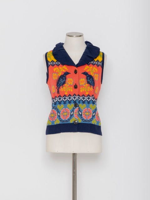 6色のニット糸をキャンバスに、絵画を描くような感覚で編み立てたジャカードニットが印象的なニットベストです。