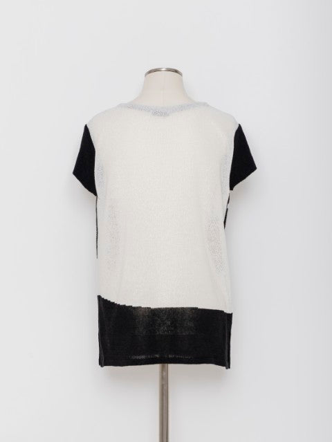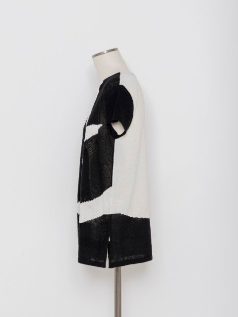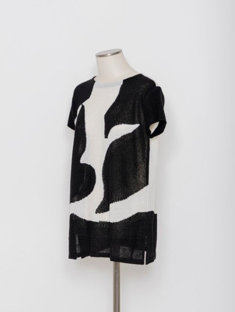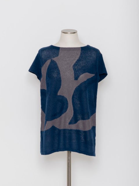 大胆に描いたリーフモチーフをインターシャ編みで表現した、存在感のあるロング丈ニットプルオーバー。