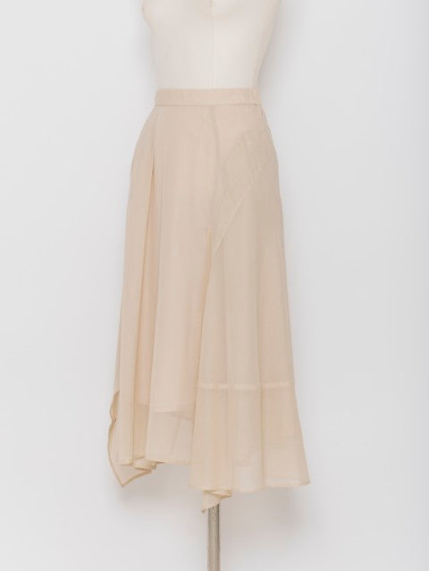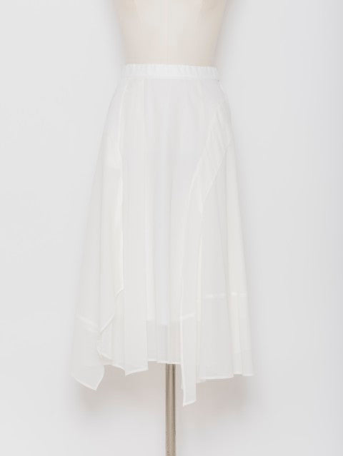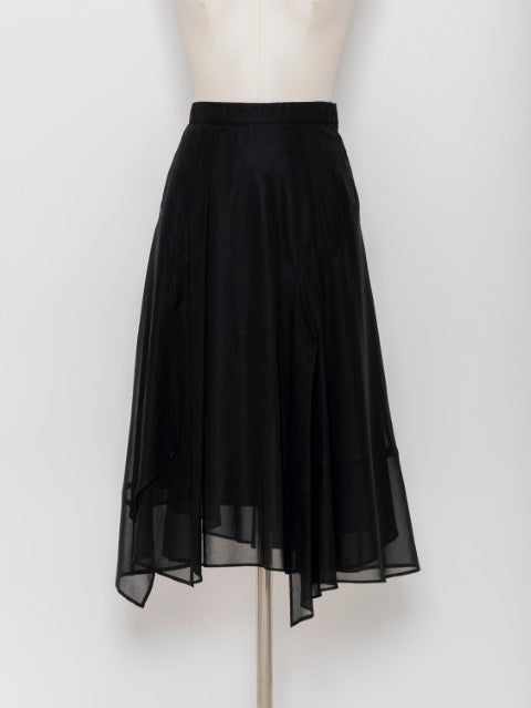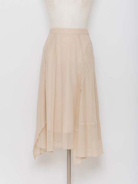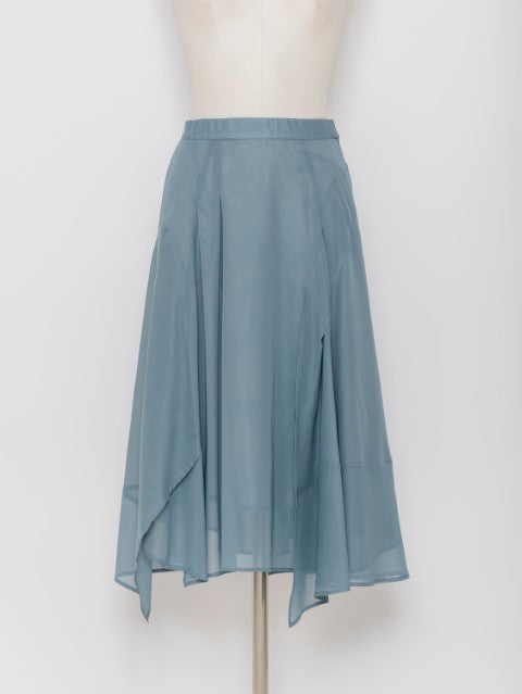 素材が持つ自然なハリが、着用時に美しいフレアシルエットを演出します。イレギュラーヘムに仕上げたスリットが、動きに合わせて軽やかで上品な印象を与えてくれる一枚です。