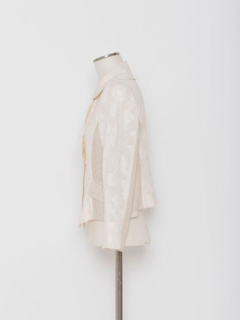華やかに織り込まれた花柄ジャカードが印象的なメッシュジャケット。立体感のある柄表現が上品さを演出し、軽やかな着心地で夏場も快適に着用いただけます。無地素材を部分使いすることで、動きのある表情と美しいシルエットを実現しています。