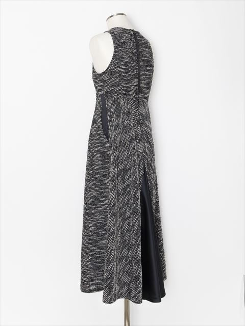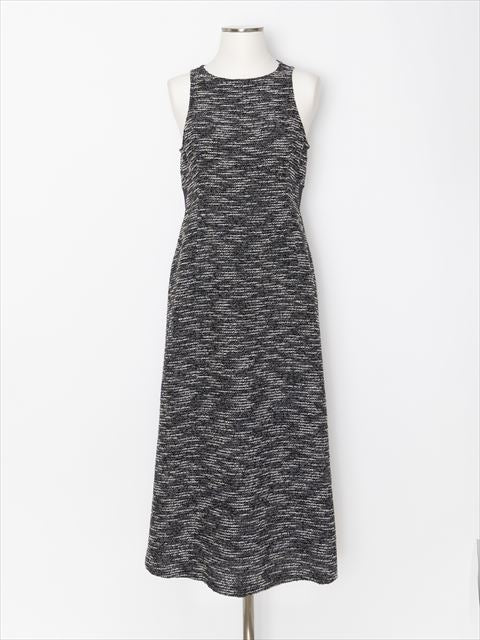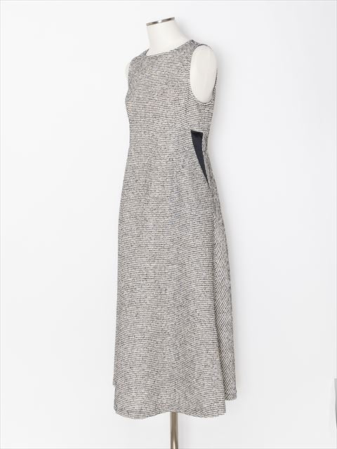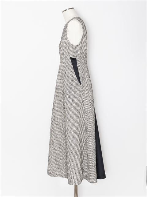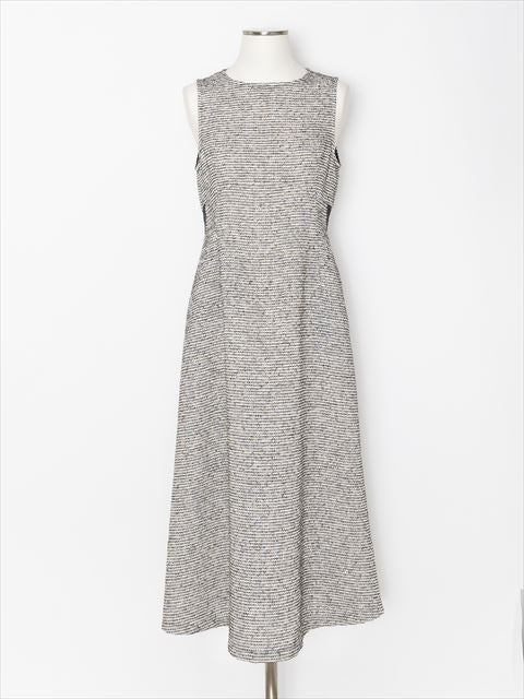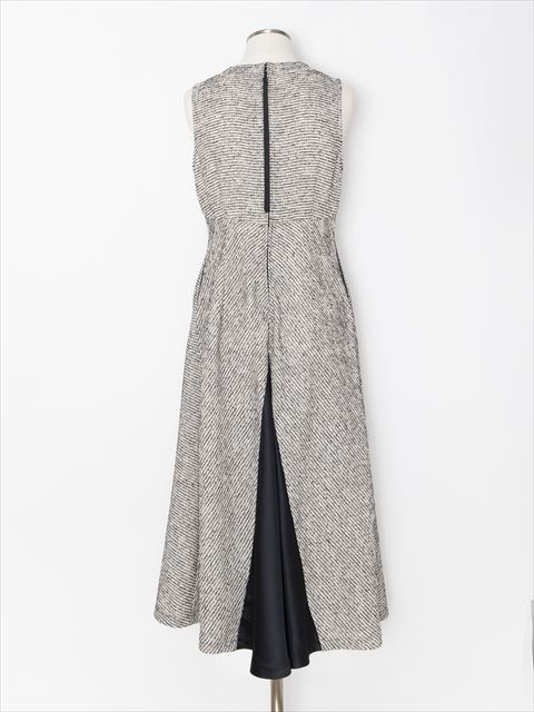 デザインの特徴:シンプルながらも立体的なシルエットにこだわったノースリーブワンピース。ウエストをほどよく絞り、裾にかけて広がるフレアラインが美しい縦長効果を演出します。バックスタイルには深めのプリーツを施し、歩くたびに上品な揺れ感が生まれます。同素材のボレロとセットアップで着用できるようデザインされているため、シーンに合わせて自在にコーディネート可能です。