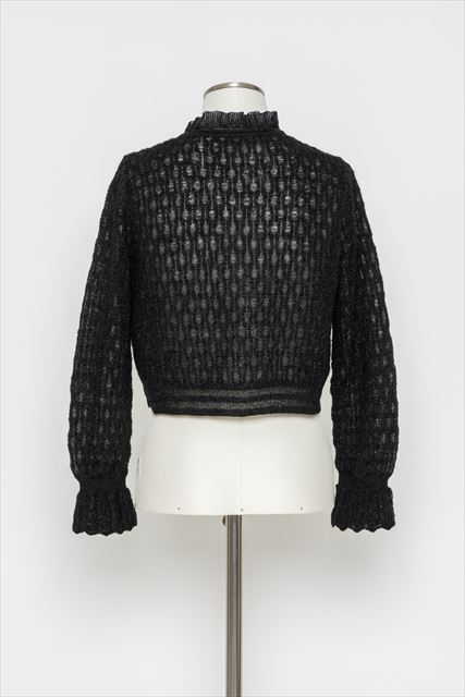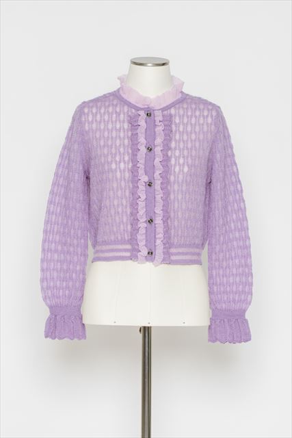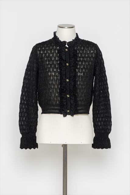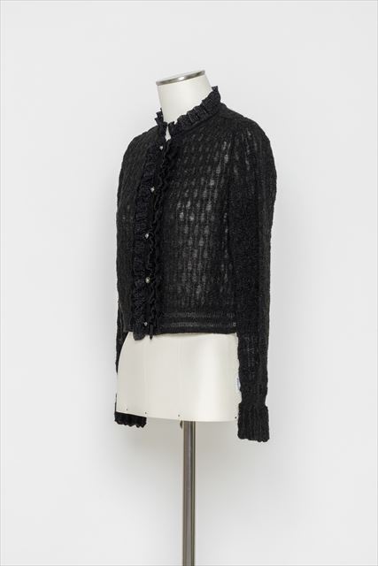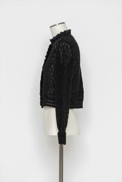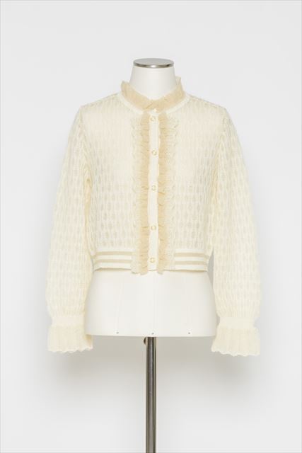 デザインの特徴:前立てと襟元、袖口にあしらわれたフリルディテールが女性らしさを引き立てるデザイン。立体感のある編地が繊細な表情を生み出し、クラシカルな雰囲気を纏いつつも現代的なエッセンスを感じさせます。金ボタンがアクセントとなり、高級感をプラスしています。