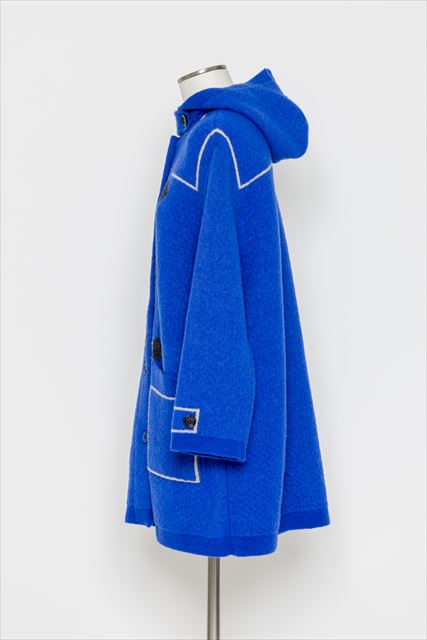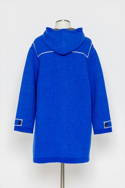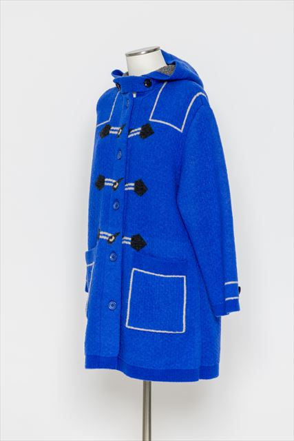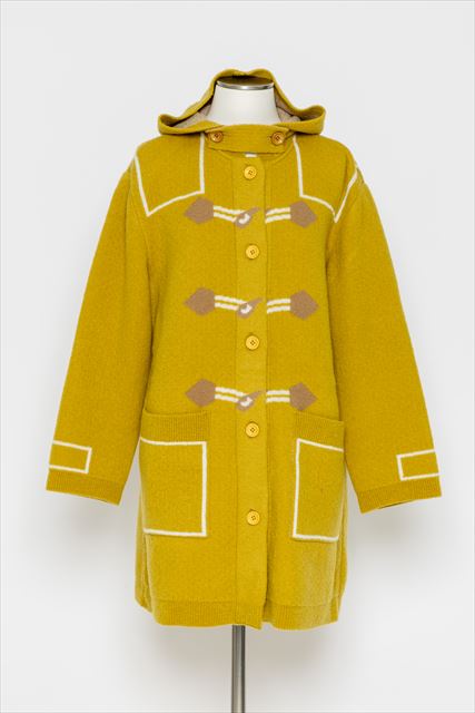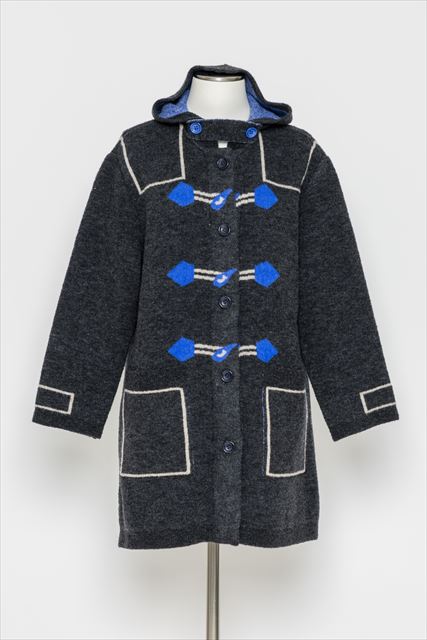 デザインの特徴:フロントに施されたダッフルコート風の「騙し絵」デザインが目を惹く、遊び心あふれるロングコート。大きめのフードや存在感のあるポケットがアクセントになり、着るだけでスタイリングが決まります。